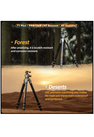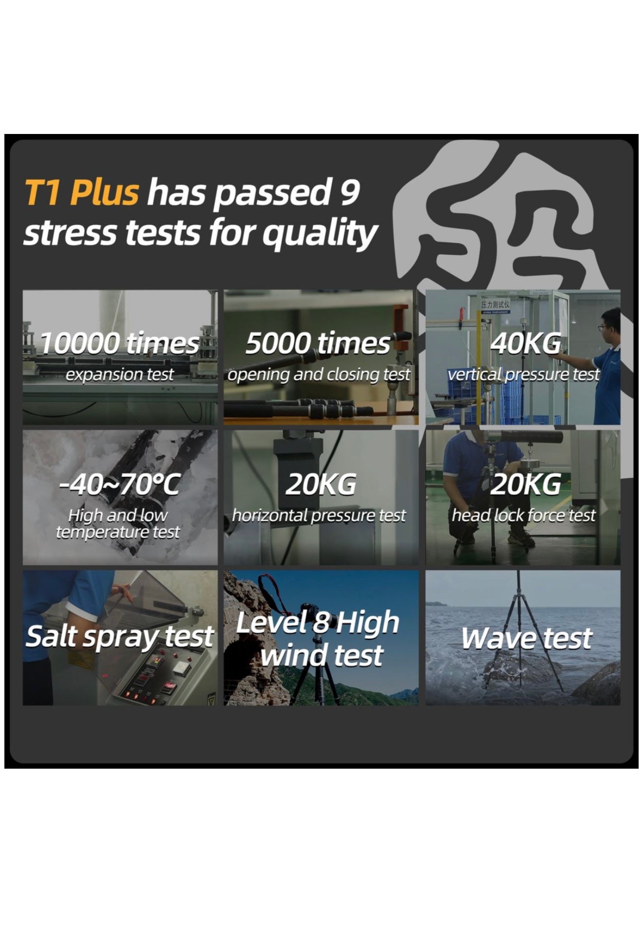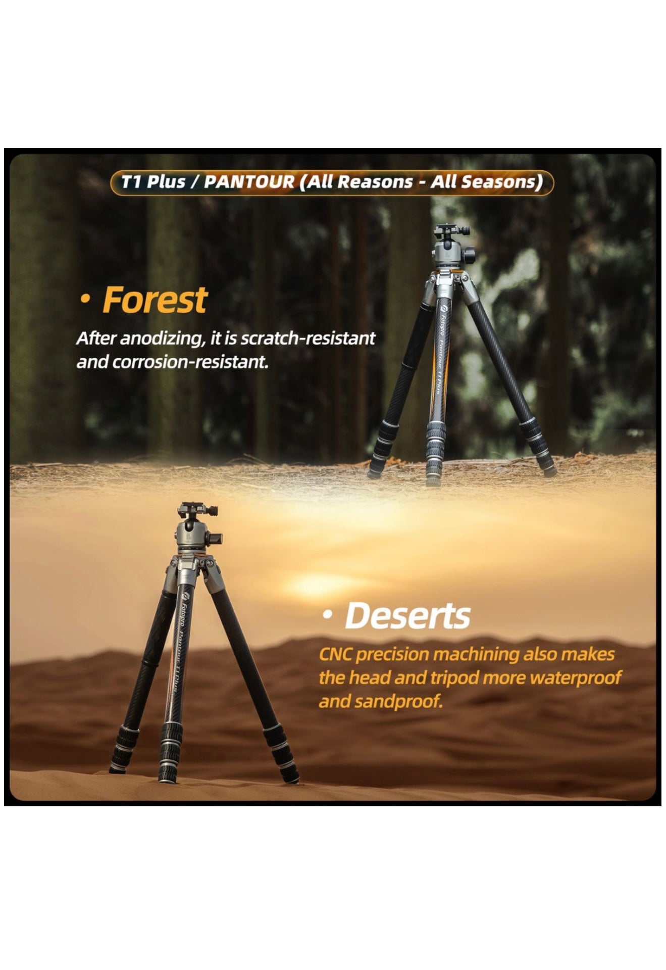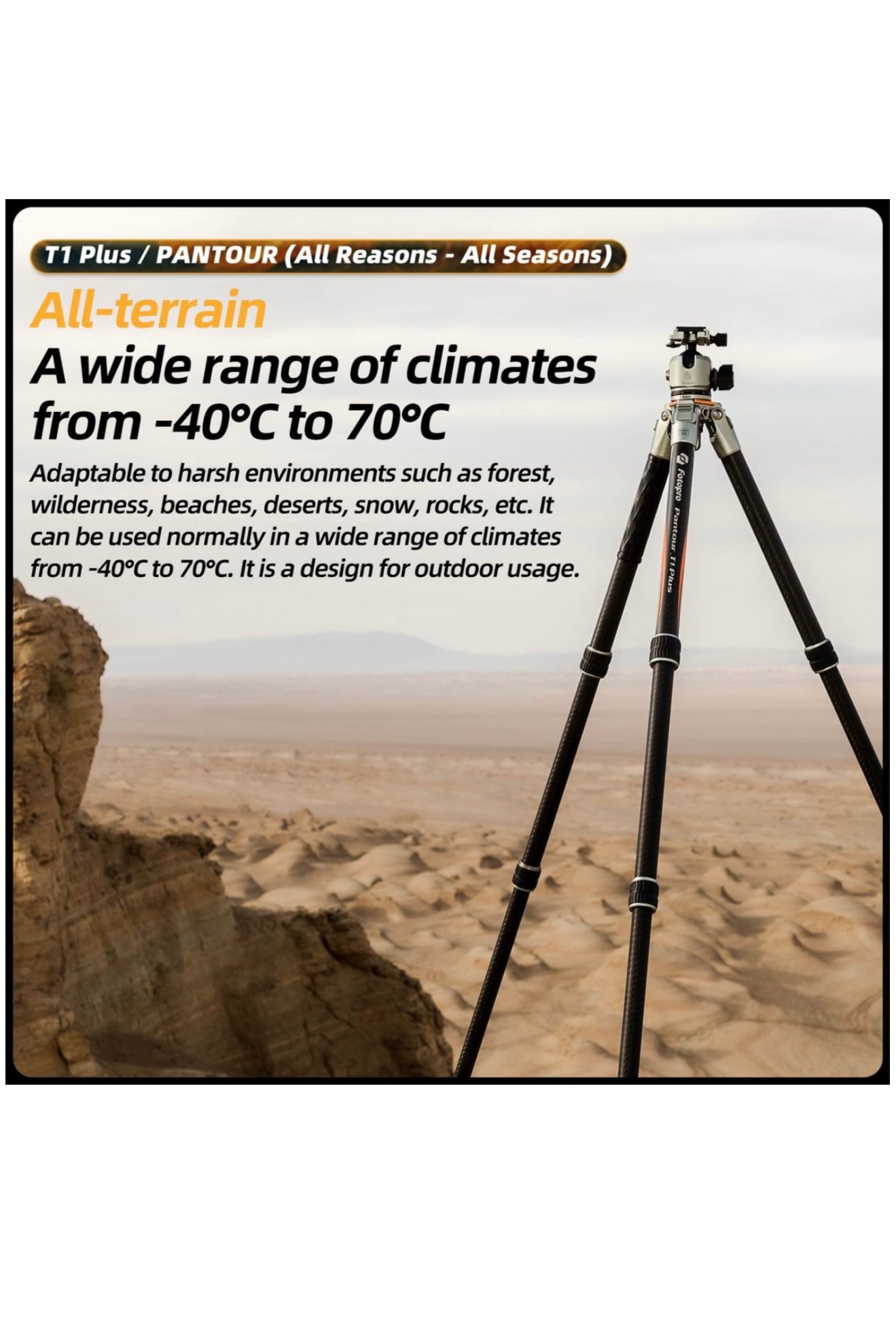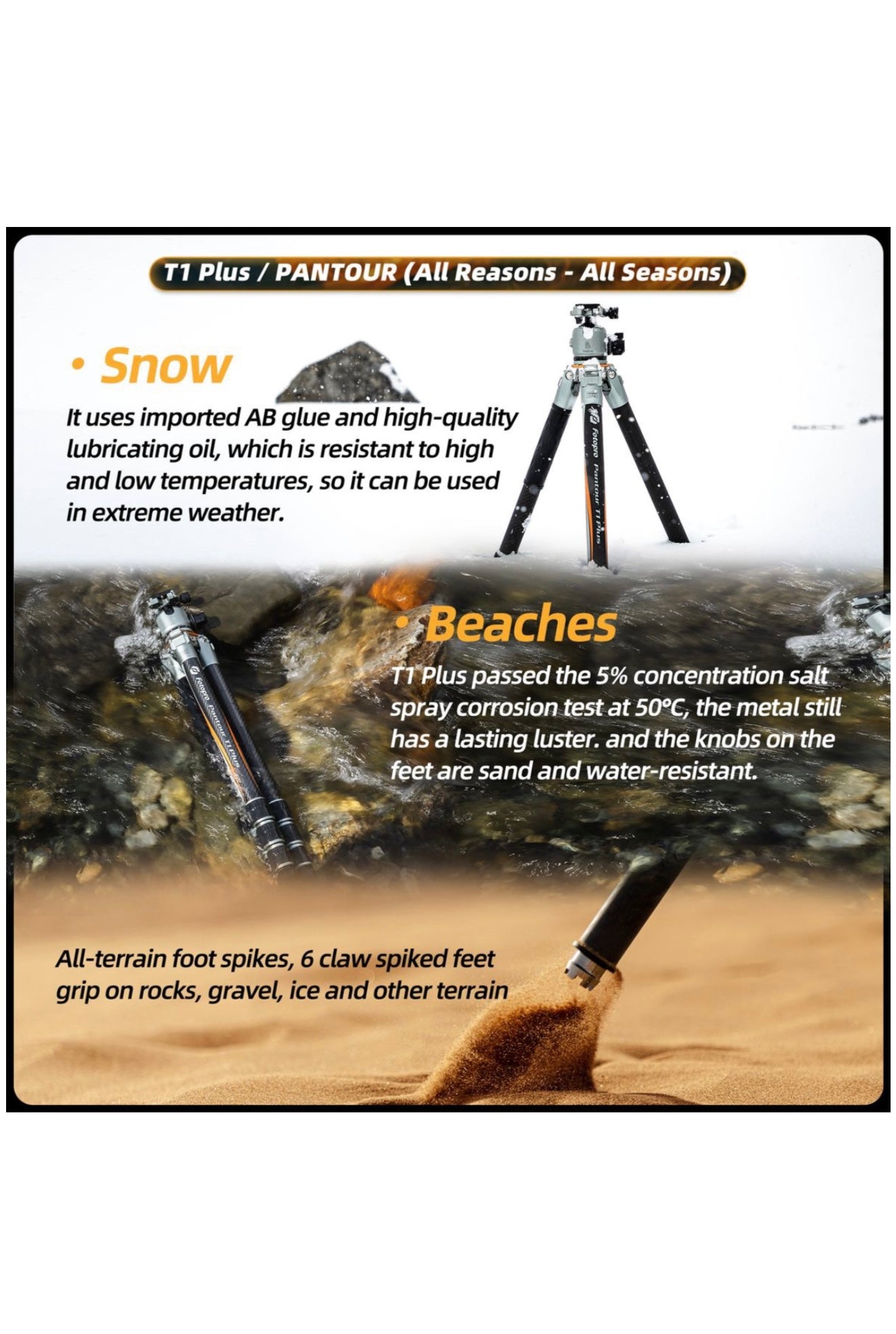 Built for All Terrains and Conditions: Whether in forests, deserts, snowfields, rocky mountains, beaches, or windy coastlines, the T1 Plus Tripod Stand adapts effortlessly. Its 6-claw all-terrain spiked feet grip securely on gravel, ice, or uneven ground, while being waterproof, sandproof, scratch-resistant, and corrosion-resistant for long-lasting reliability.