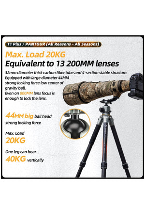 Heavy-Duty Load Capacity: With a max load of 20kg-equivalent to 13× 200mm lenses-it supports even the heaviest professional setups. The 44mm low center of gravity ball head ensures rock-solid locking, even with 800mm telephoto lenses.