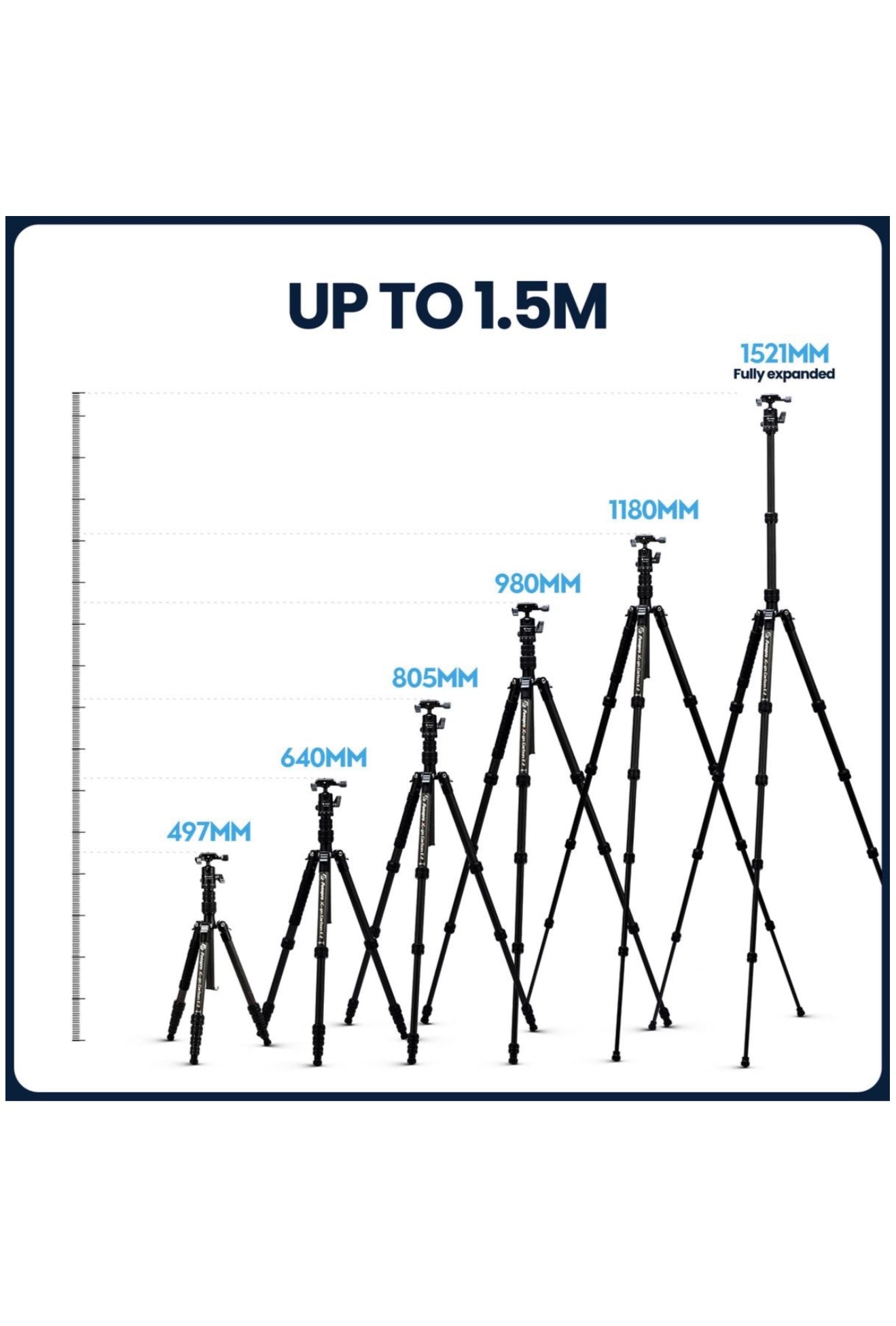 With a maximum height of 1521mm and a load capacity of 8kg, it supports DSLRs, mirrorless cameras, and heavy telephoto lenses with total stability. Its 5-section design offers flexible adjustments from a minimum height of 346mm, adapting to every shooting condition.