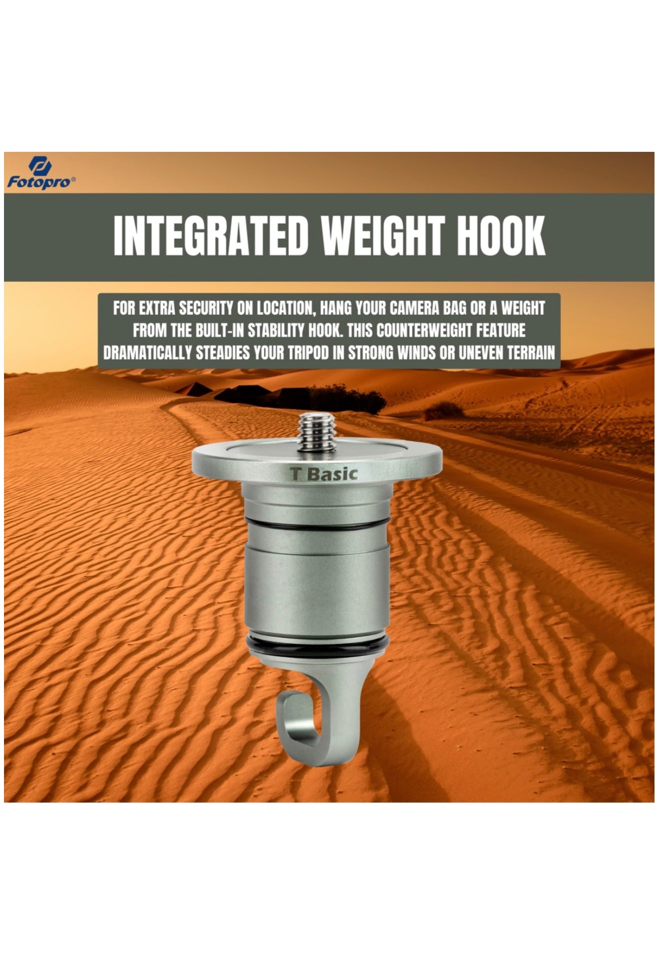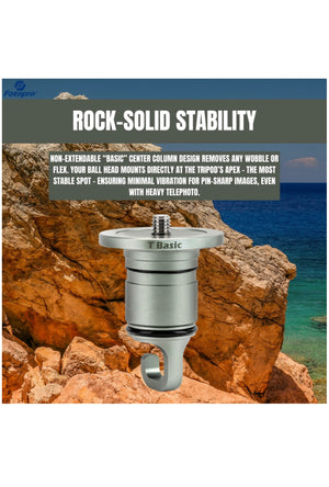 The Fotopro T-Basic Center Column is a compact, non-extendable attachment that connects your ball head directly to the Fotopro T1 Plus tripod base. By eliminating the traditional center column, it transforms your tripod into a low-profile, rock-solid support system for your camera. This "no center column" configuration delivers the absolute highest stability, ideal for sharp long-exposure photos and shake-free videos even with heavy gear. The T-Basic includes an integrated weight hook at the bottom, so you can hang a camera bag or sandbag for added steadiness in windy. Despite its small size, this short center column supports the full 20 kg load capacity of the Fotopro T1 Plus, letting you confidently use bulky DSLRs, telephoto lenses, or video rigs without worry.