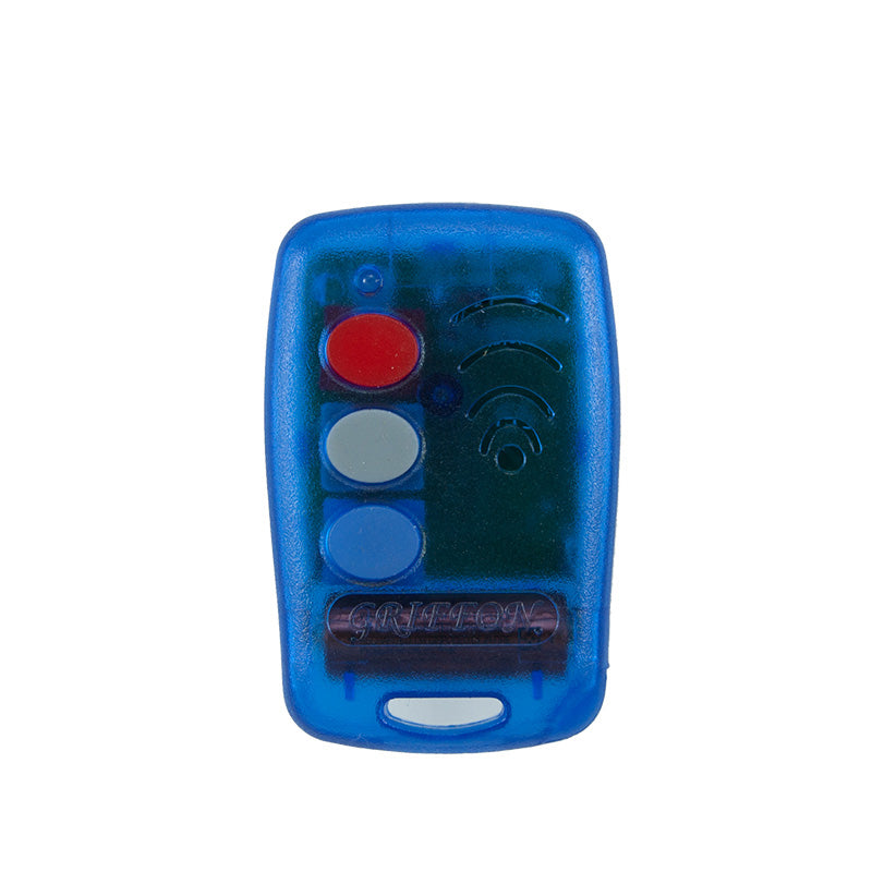 Griffon 3 button transparent blue 403mHz remote transmitter, this remote can copy 12 way binary, 9 way trinary and 12 way french 403mHz code. This remote is the common replacement for other Griffon 403mHz dip switch remotes.