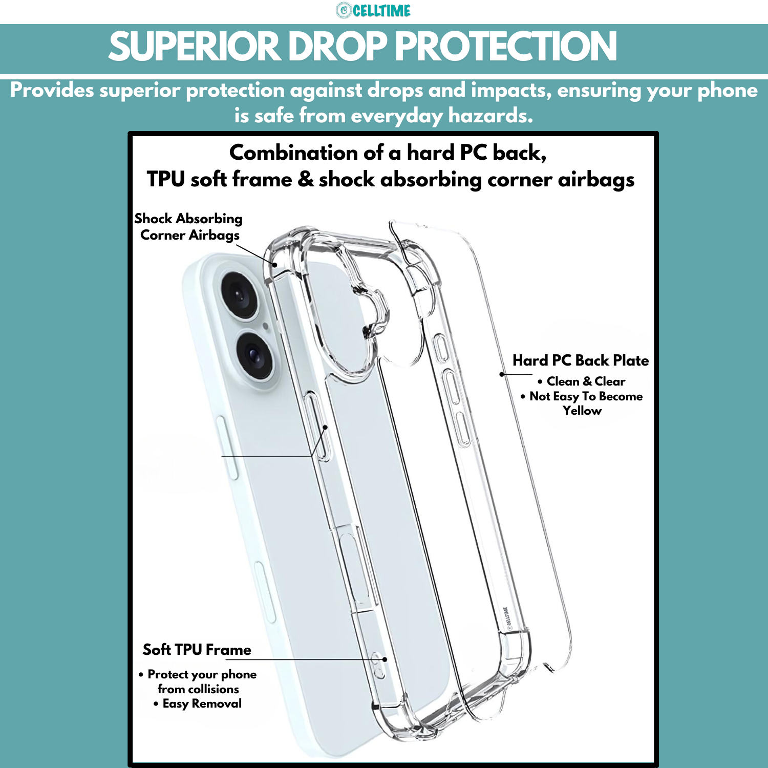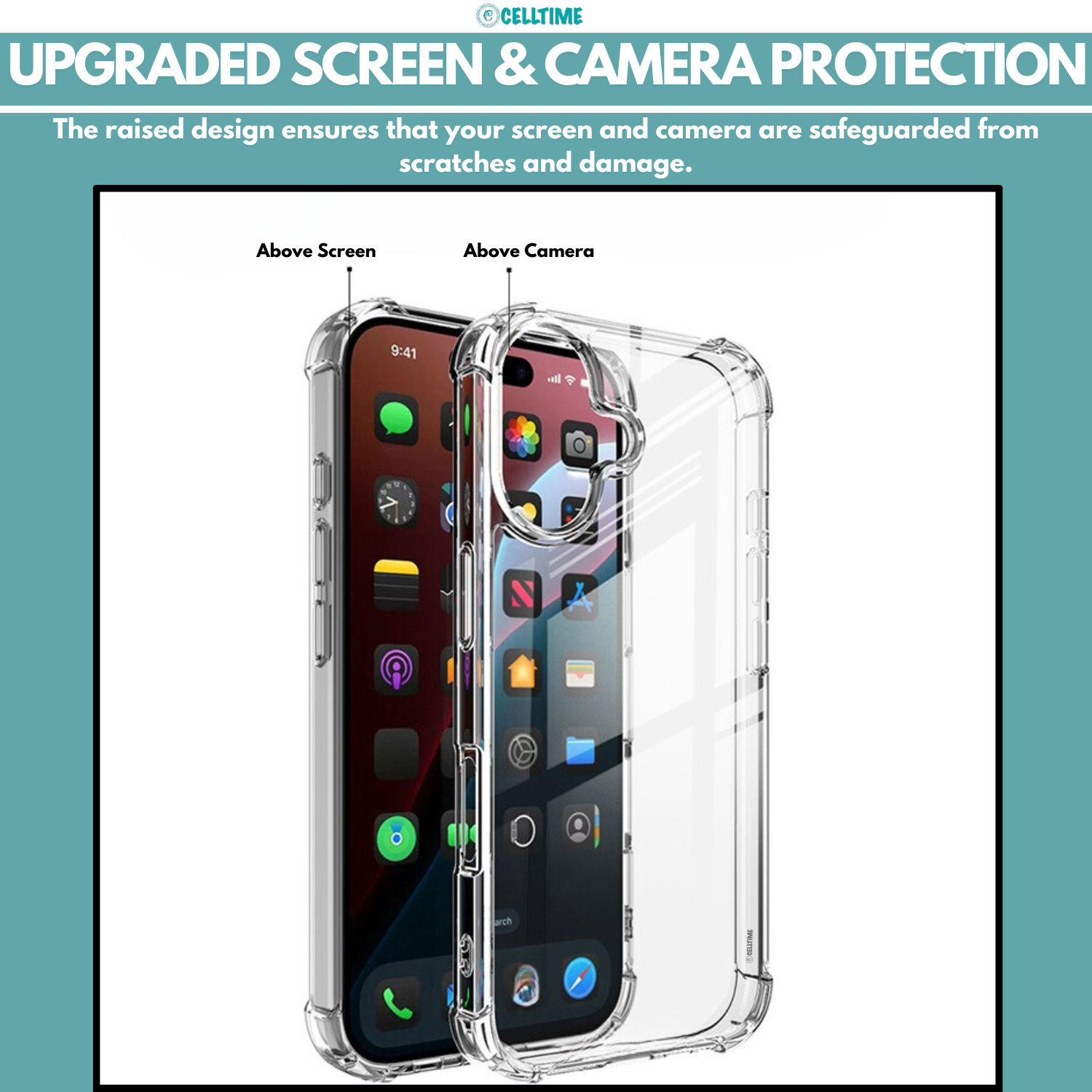 Full Protection: The CellTime Clear Shock Resistant Armor Case provides full protection for your iPhone 16. With a raised edge design for both the screen and camera, this case effectively shields your device from scratches, abrasions, and direct impact. Whether your phone is face-down or on its back, your screen and camera lenses remain elevated and protected from surfaces that could cause damage.