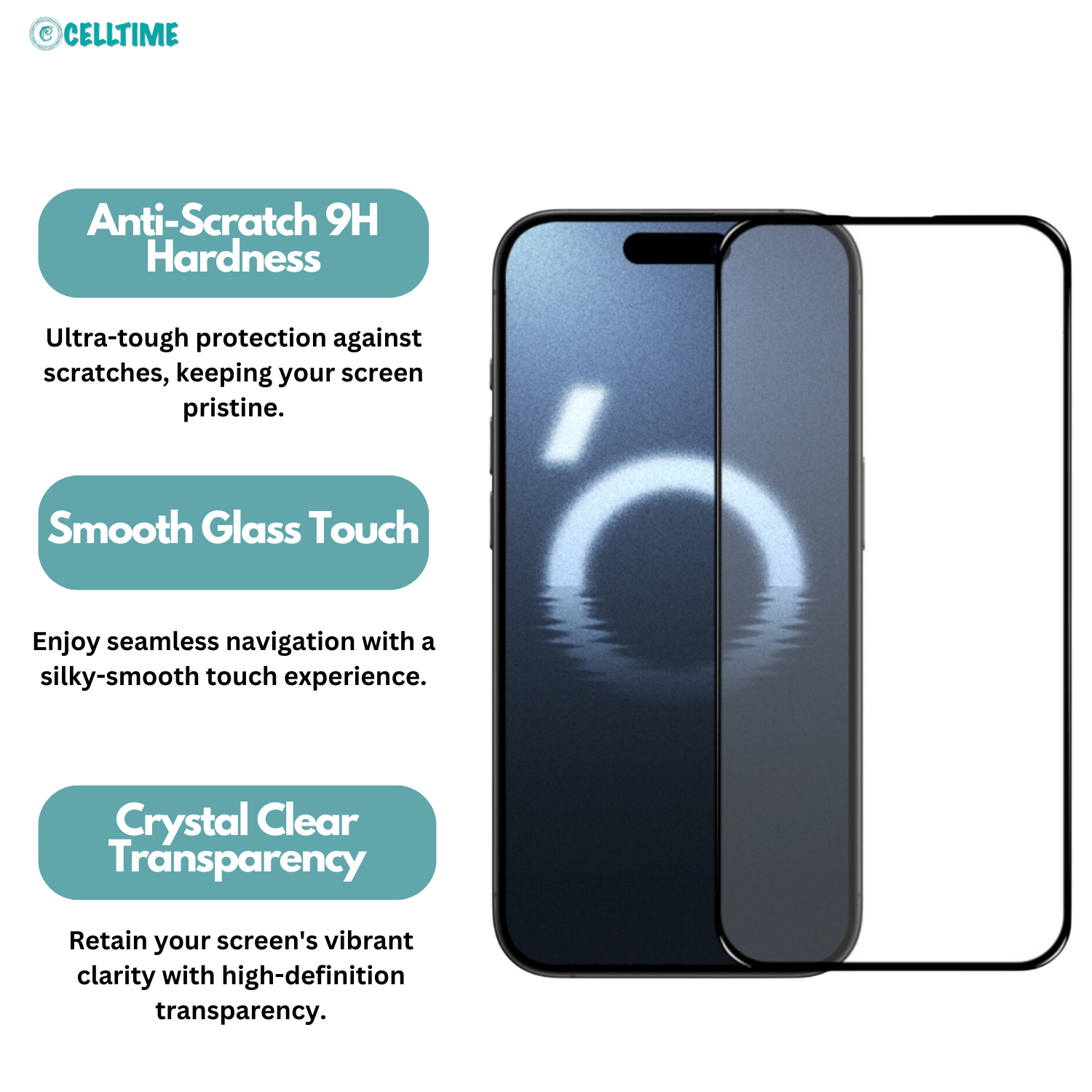 Crystal Clear Clarity: Enjoy vibrant colors and sharp details with remarkable transparency. The CellTime screen protector ensures your device's display shines through without distortion or cloudiness, maintaining the original visual quality of your iPhone 16 Pro / 16 Pro Max.