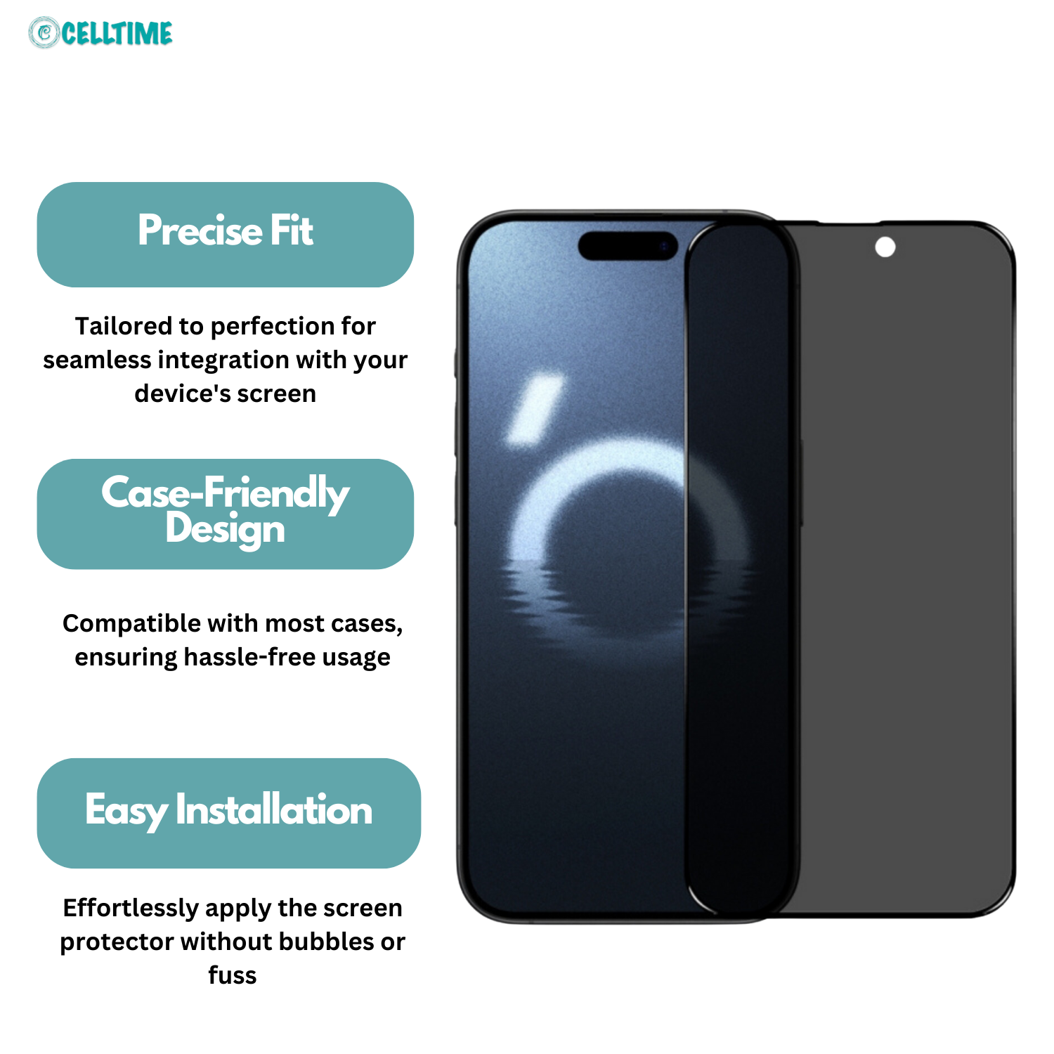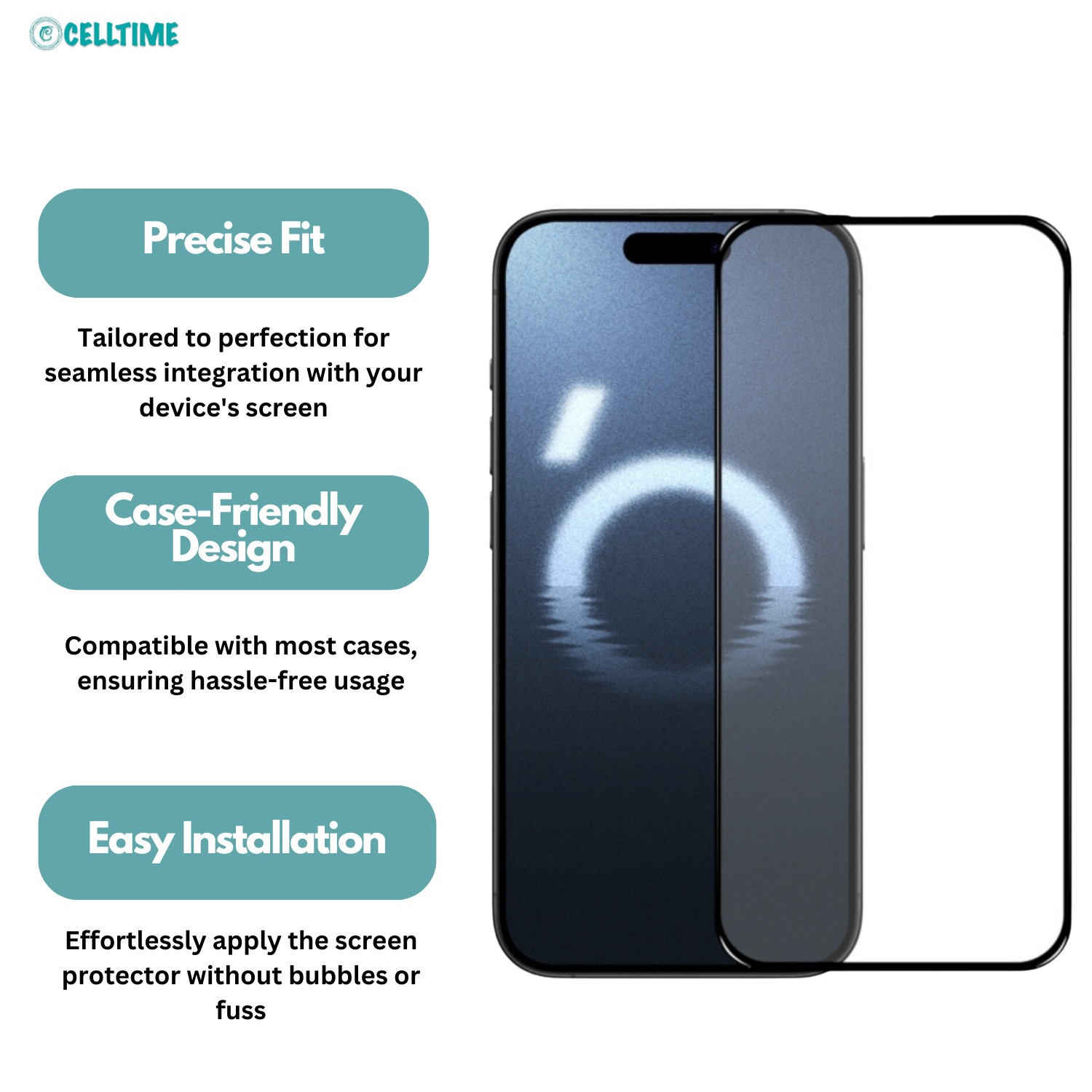 Case-Friendly Design: Compatible with most cases, the CellTime protector ensures full protection without compromising your preferred case's fit or style. The precise cutouts and dimensions allow for easy installation alongside your favorite case, offering comprehensive protection for your device.