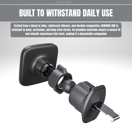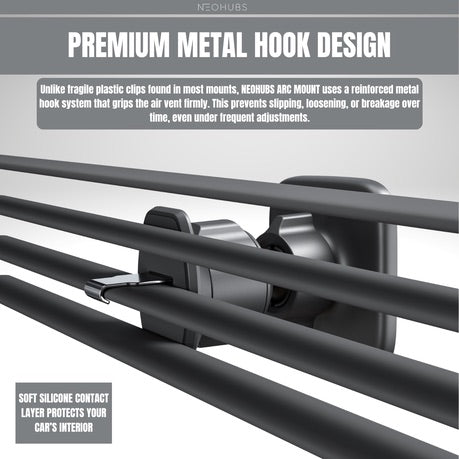 Premium Metal Hook Design: Unlike fragile plastic clips found in most mounts, NEOHUBS ARC Magnetic Car Phone Holder uses a reinforced metal hook system that grips the air vent firmly. This prevents slipping, loosening, or breakage over time, even under frequent adjustments. Combined with a soft silicone contact layer, it protects your car's interior while delivering long-term durability.