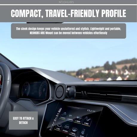 Compact, Travel-Friendly Profile: The compact design keeps your vehicle uncluttered and stylish. Lightweight and portable, NEOHUBS ARC MagSafe Car Holder can be moved between vehicles effortlessly, making it an ideal choice for users who share cars, rent vehicles, or frequently travel. When not in use, it detaches easily and can be stored without bulk.