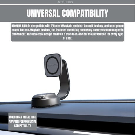 The NEOHUBS HALO Magnetic Car Phone Holder is designed for drivers who demand seamless functionality, rugged reliability, and modern design in one compact mount. Built with ultra-strong MagSafe-compatible magnets and an easily adjustable arm, it offers secure, one-handed phone mounting with 360 rotation. From quick commutes to long road trips, the NEOHUBS HALO car mount delivers unmatched convenience, stability, and flexibility-ensuring your phone stays within reach and your focus remains on the road.