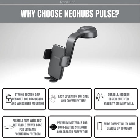 The NEOHUBS PULSE Dashboard Car Phone Mount is engineered for drivers who demand both control and comfort on every journey. Designed with a flexible arm, a 360 rotatable swivel section, and a secure suction base, it delivers a reliable hands-free experience that adapts to your needs whether on daily commutes or long road trips. Built for stability, convenience, and universal compatibility, the NEOHUBS PULSE Car Phone Holder ensures your phone stays securely in place while keeping you focused on the road.