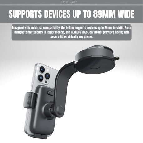 Designed with universal compatibility, the holder supports devices up to 89mm in width. From compact smartphones to larger models, the NEOHUBS PULSE Adjustable Car Phone Holder provides a snug and secure fit for virtually any phone.