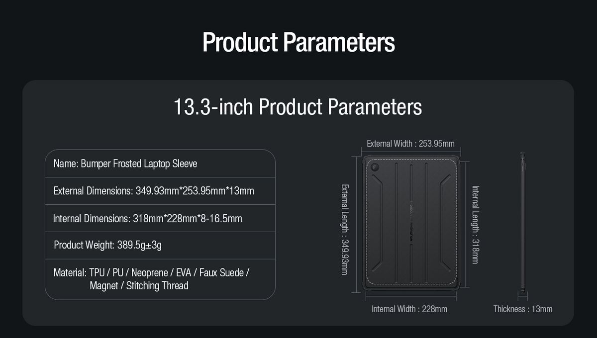 Introducing the Nillkin Bumper Frosted Laptop Sleeve - a fusion of style and functionality designed to elevate your laptop experience for Macbook Air 13" / Macbook Pro 13" and more! Crafted with innovation and versatility in mind, this laptop sleeve transcends the ordinary, transforming into a statement of sophistication.