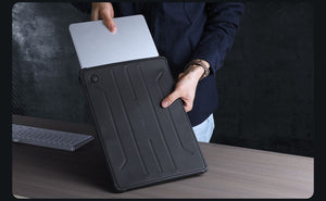 Engineered with a unique blend of leather and TPU materials, our sleeve offers a robust defense against shocks and impacts. The highly shock-resistant frame, fortified with four anti-shock airbags on each side, ensures your laptop's safety in any situation. The advanced shock-resistant design ensures that your laptop remains well-protected, even in challenging environments.