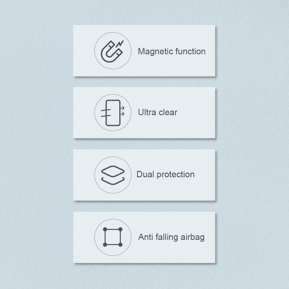 Add magnetic function to realize fast charging. Adopt environmental friendly TPU and PC material, which is a soft and hard combination to provide a better protection. Increase impact resistant airbags on four corners, non-slip bars on two sides. Fit your mobile phone completely by molding as original phone.