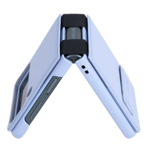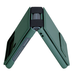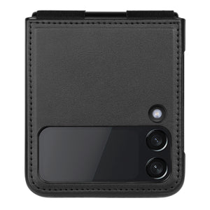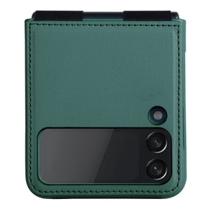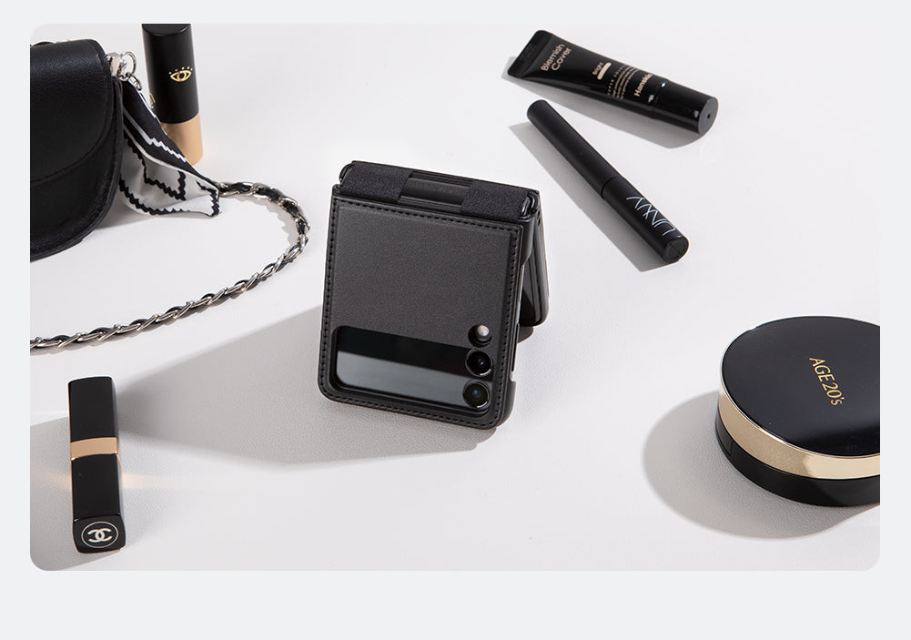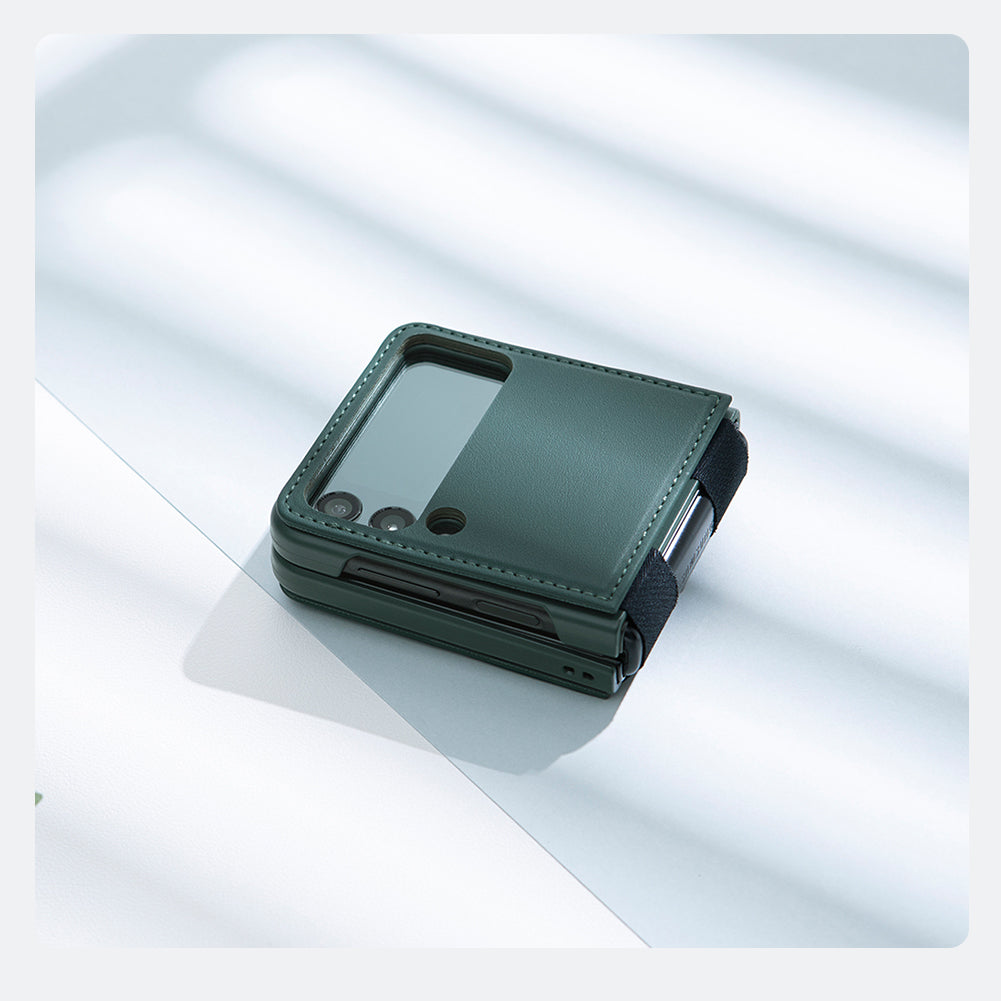 Qin Leather Case, is tailored for folding-screen mobile phones, Samsung Galaxy Z Flip 4 5G. The surface is made of fine grain PU leather, combined with manual sewing technology, which deduces the beauty of light luxury fashion, easily controls all kinds of social occasions, and is resistant to fingerprint oil stain and durable. The shell is made of imported PC material, which is fully protected against falling and scraping. When folding the elastic band is used to effectively prevent hinge wear, and automatically unfold and hide.