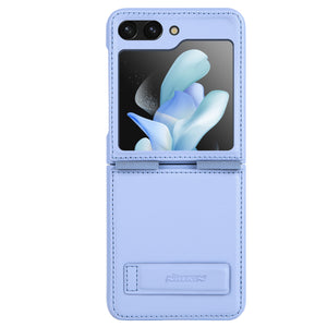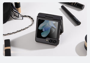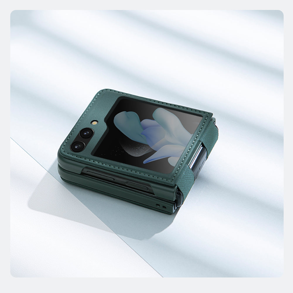 Qin Leather Case, is tailored for folding-screen mobile phones, Samsung Galaxy Z Flip 5 5G. The surface is made of fine grain PU leather, combined with manual sewing technology, which deduces the beauty of light luxury fashion, easily controls all kinds of social occasions, and is resistant to fingerprint oil stain and durable. The shell is made of imported PC material, which is fully protected against falling and scraping. When folding the elastic band is used to effectively prevent hinge wear, and automatically unfold and hide.