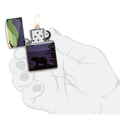Immersive, vivid, durable designs are the new frontier of Zippo’s unparalleled decorative abilities. Zippo’s new 540 Color process allows for complete coverage of the lighter’s surface with precision artwork. This landscape design utilizes the 540 Color process to create this picturesque scenic view. In the foreground of the design, you will find a bear that brings a touch of wildlife to the rich forest. Hinges and bottom stamps are laser engraved to allow for peak performance and easy date stamp verification, but otherwise, every single nanometer of the lighter’s surface can is covered by this resilient new process. Comes packaged in a gift box. For optimal performance fill with Zippo lighter fuel.