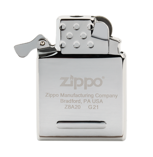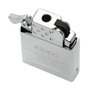 All Zippo Butane Inserts will be packaged and shipped unfilled. To start filling, remove Zippo insert from either the packaging or lighter case. When removing places on either side of the insert below the chimney. Be sure to flip the insert into an upside-down position. Be sure to fill or refill in a well-ventilated place, and always keep the insert or lighter away from face.