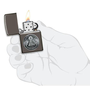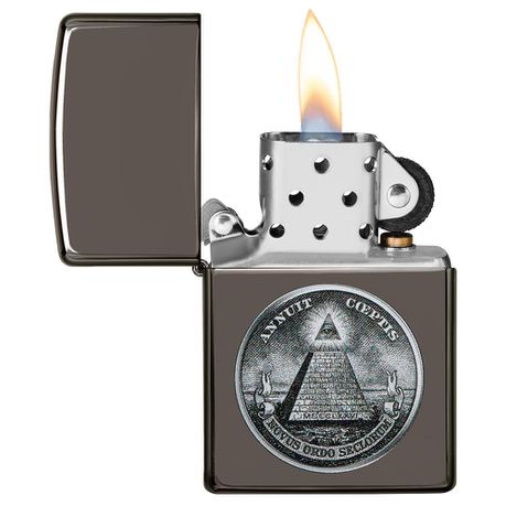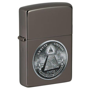 Study the mysteries behind the American Dollar’s Great Seal featured on this Black Ice ® lighter. The color imaging process is used to create this United States currency design. Comes packaged in a gift box. For optimal performance fill with Zippo lighter fuel.