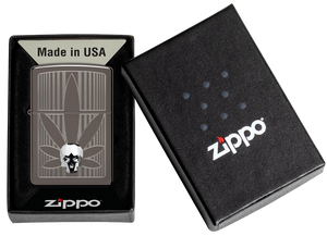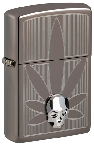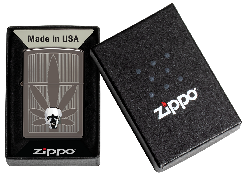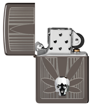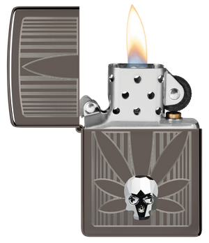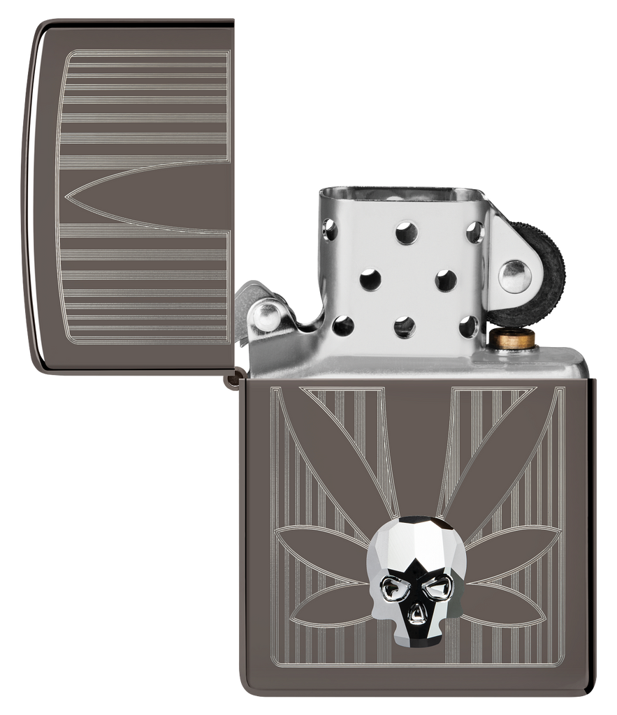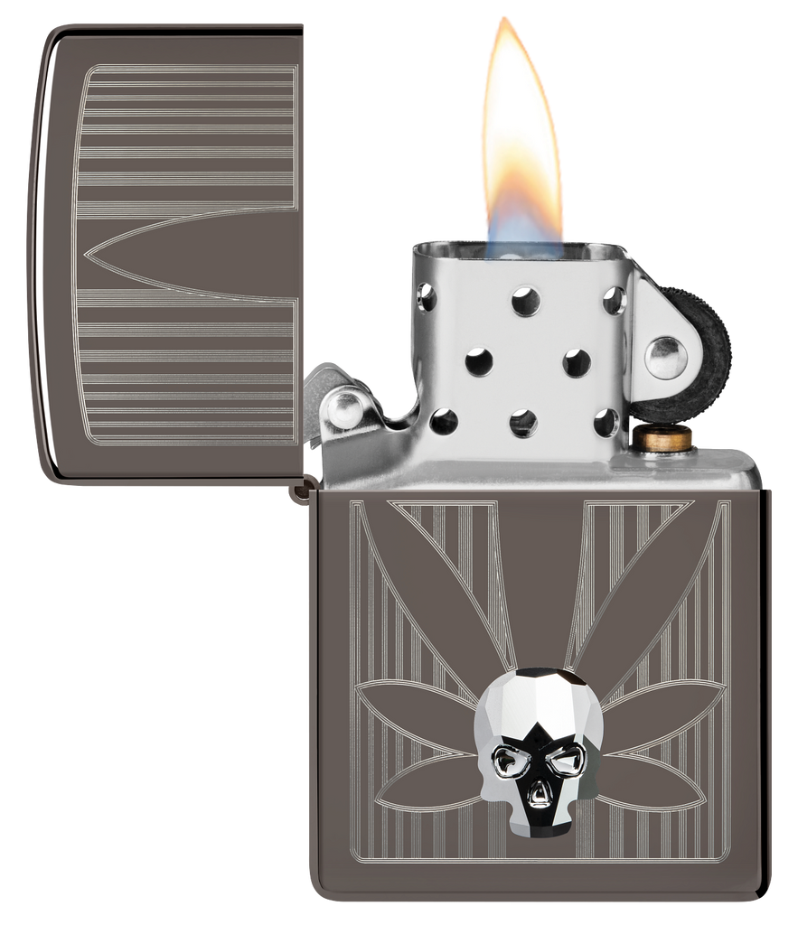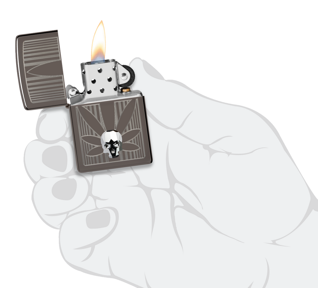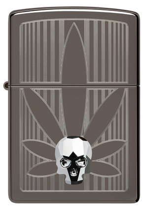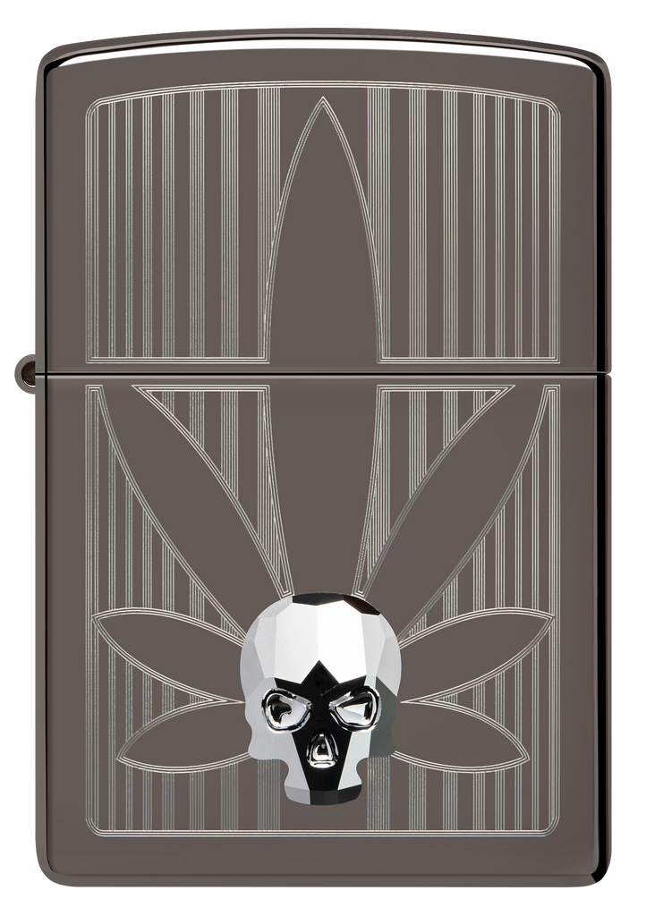 A crystal skull gleams from the surface of this silky-smooth Black Ice® lighter over a crisp Auto Engrave cannabis leaf. Comes packaged in a gift box. For optimal performance, fill with Zippo lighter fuel.