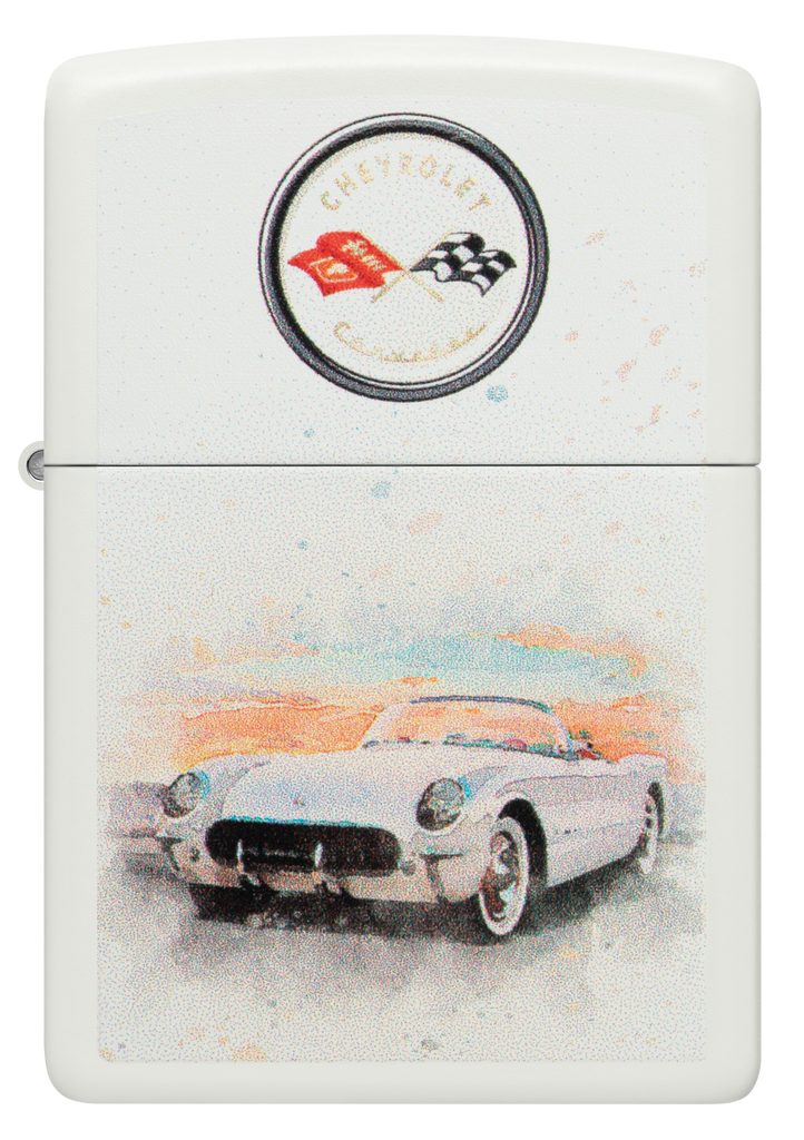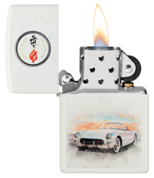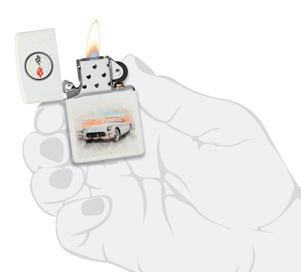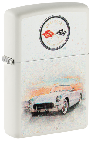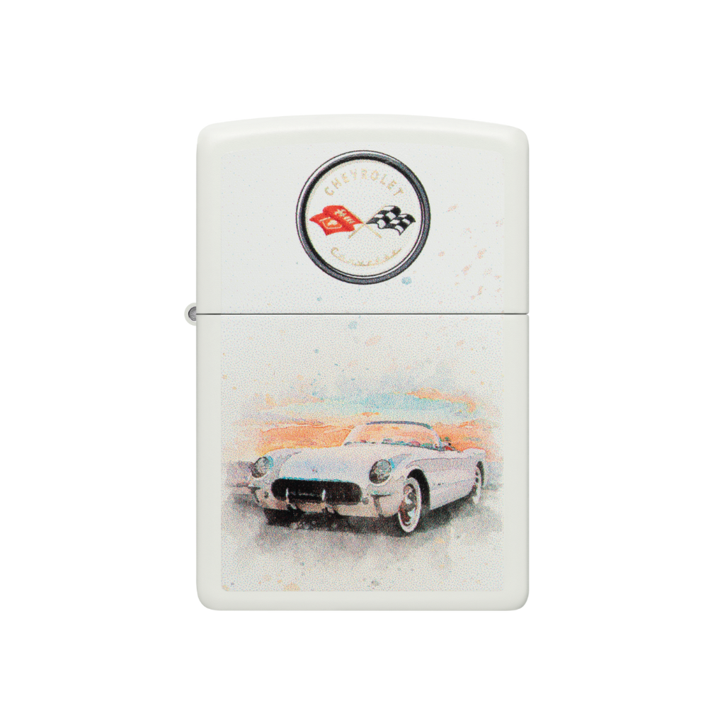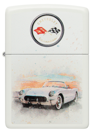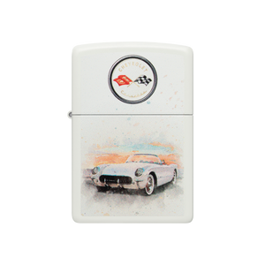 A first-generation Corvette® roars across the surface of this White Matte lighter. The classic roadster appears under the vintage Corvette logo in this dashing Color Image design. Comes packaged in a gift box. For optimal performance fill with Zippo lighter fuel.