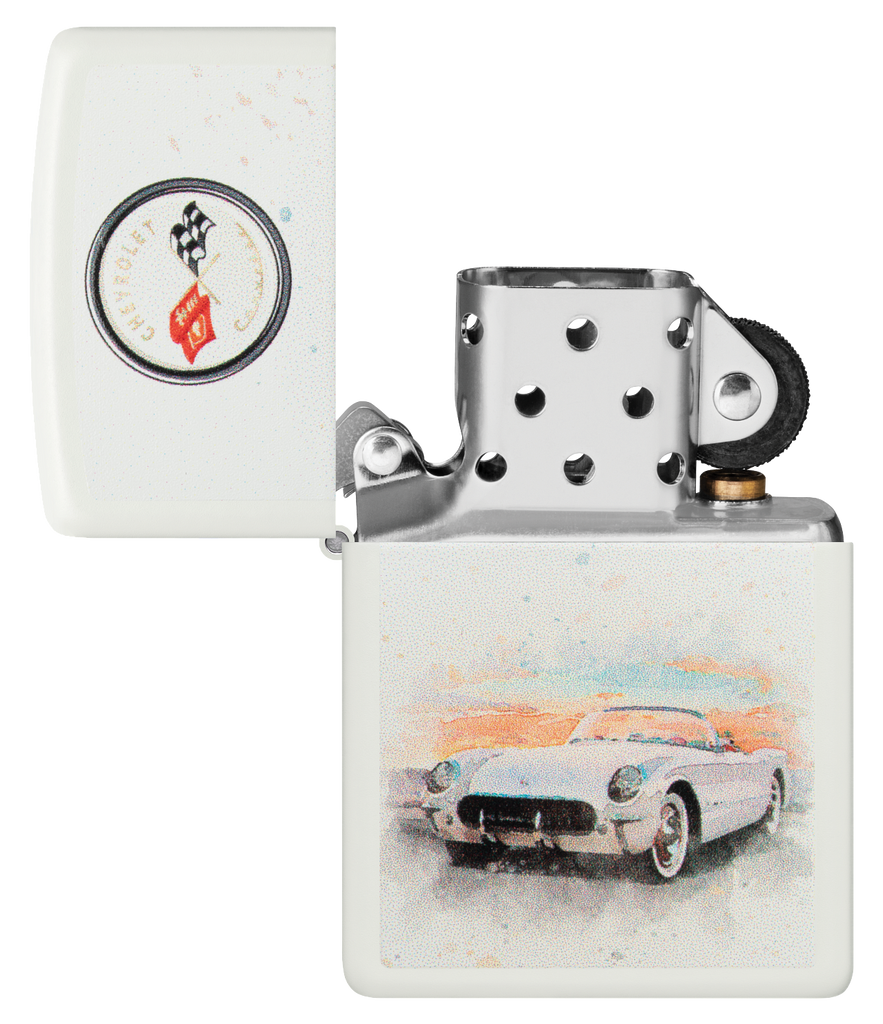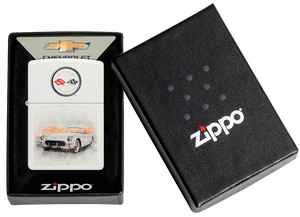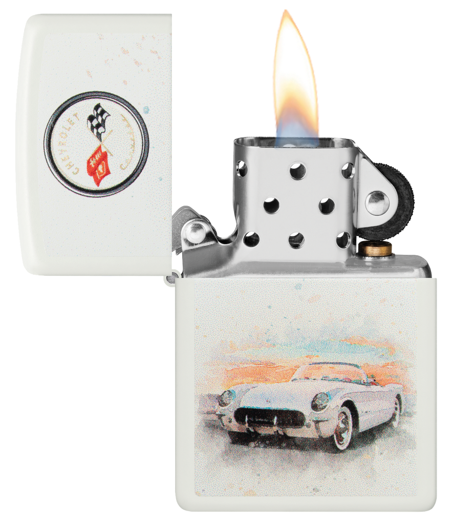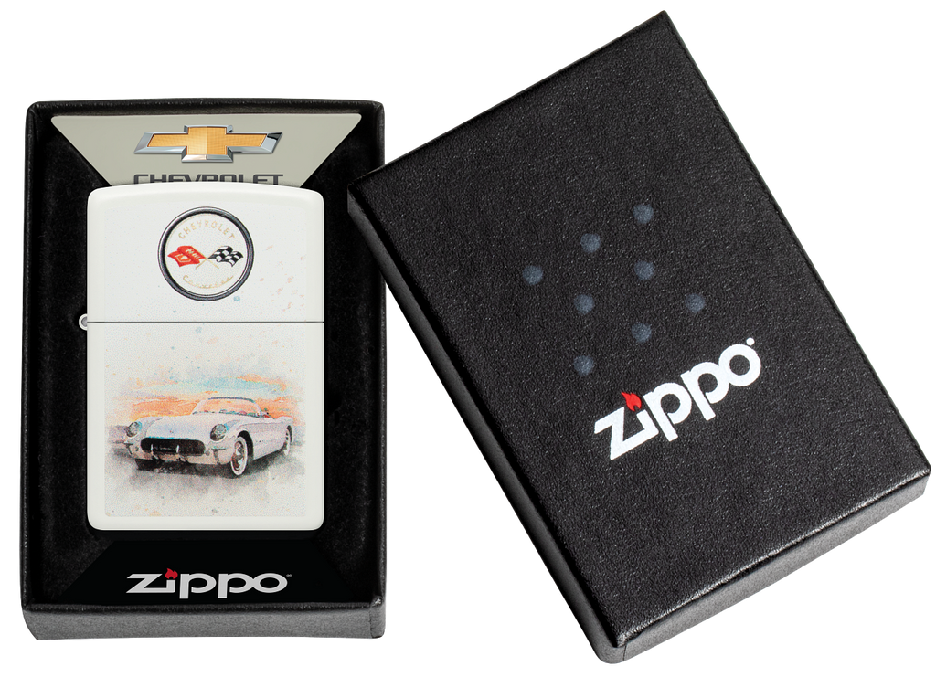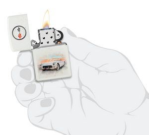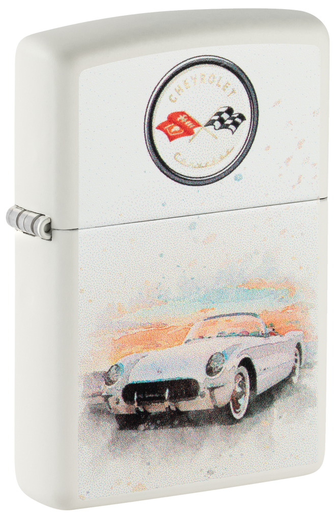 A first-generation Corvette® roars across the surface of this White Matte lighter. The classic roadster appears under the vintage Corvette logo in this dashing Color Image design. Comes packaged in a gift box. For optimal performance fill with Zippo lighter fuel.