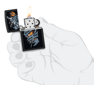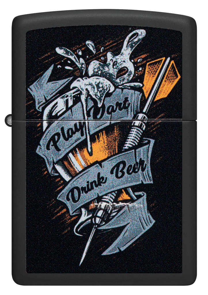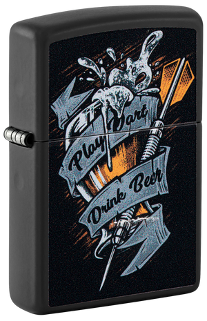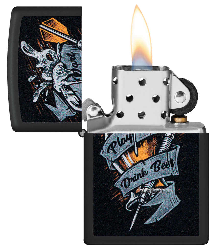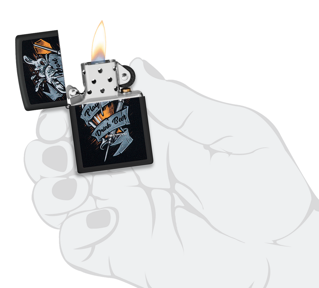 If you're not ready to commit to a tattoo of your favorite motto, you can at least carry it with you on this Black Matte lighter. The vibrant Color Image design depicts the recipe for a fun evening in a tattoo-inspired style. Comes packaged in a gift box. For optimal performance, fill with Zippo lighter fuel.
