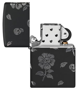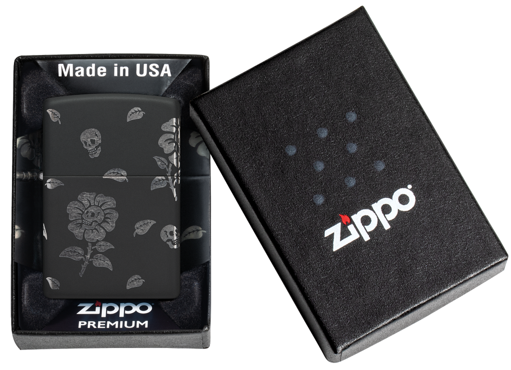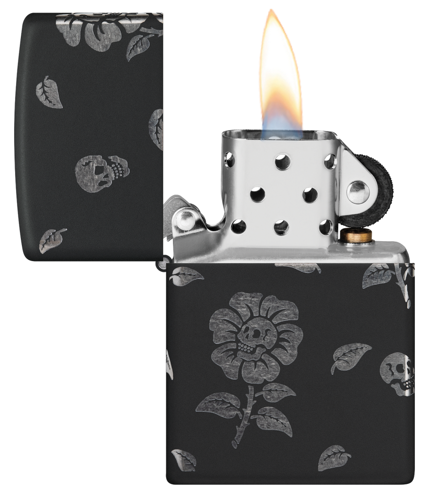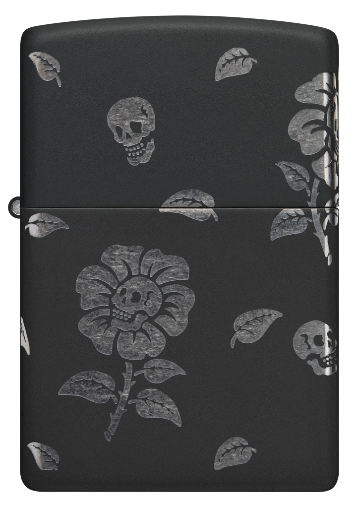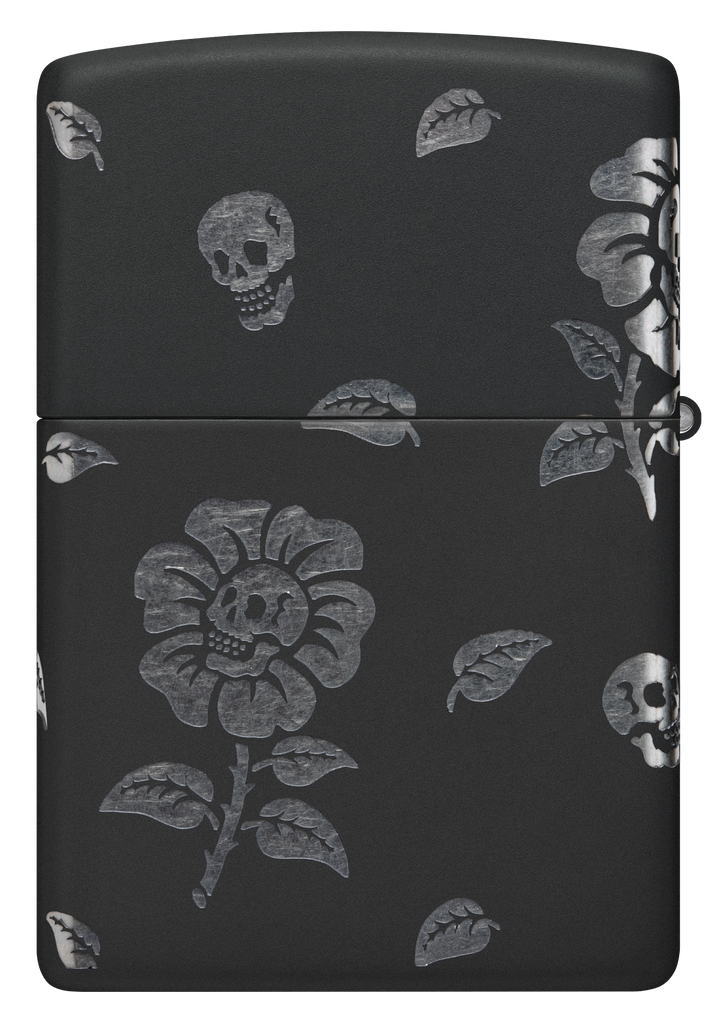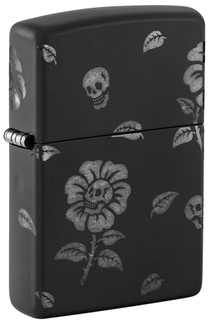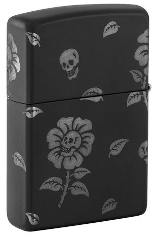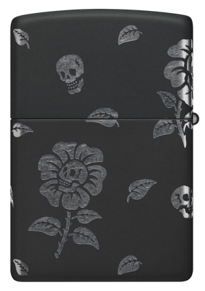 Grinning skulls form the centers of blooming flowers that delicately dance around all sides of this classic Black Matte lighter. Our Laser 360° process is used to reveal the chrome tones of the lighter's case beneath the sleek finish. Comes packaged in a gift box. For optimal performance fill with Zippo lighter fuel.