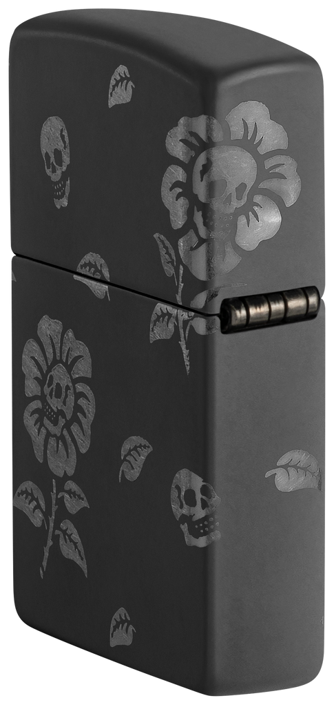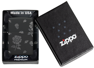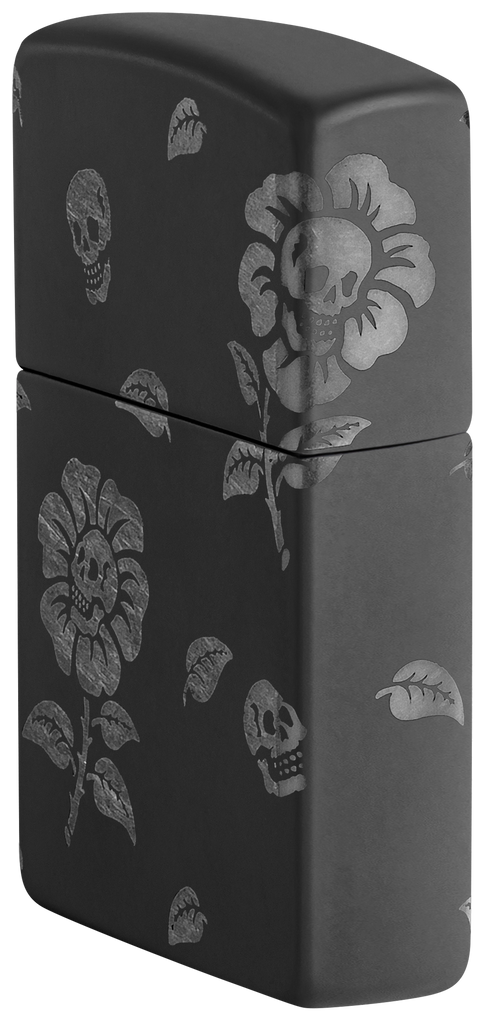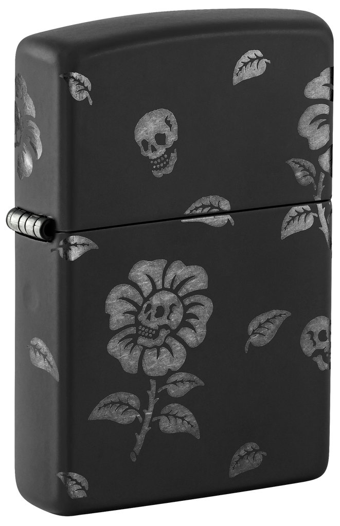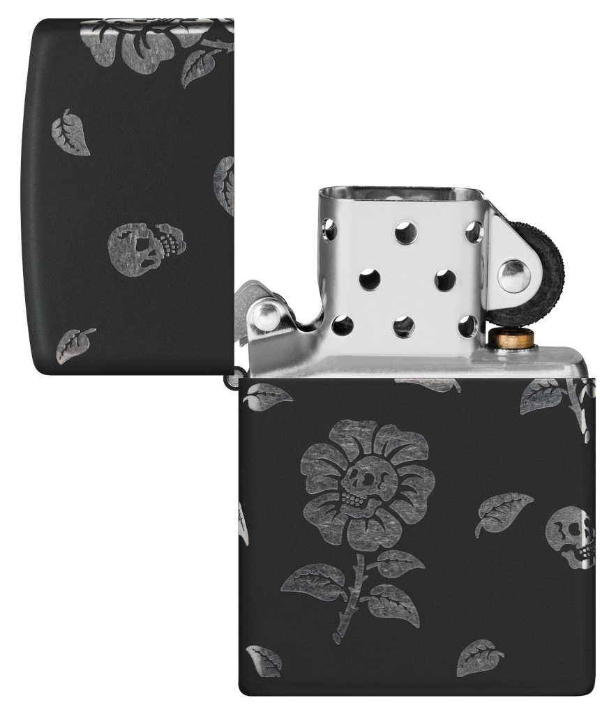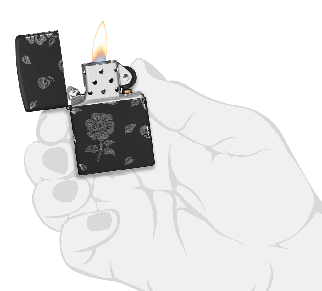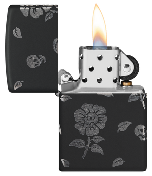 Grinning skulls form the centers of blooming flowers that delicately dance around all sides of this classic Black Matte lighter. Our Laser 360° process is used to reveal the chrome tones of the lighter's case beneath the sleek finish. Comes packaged in a gift box. For optimal performance fill with Zippo lighter fuel.