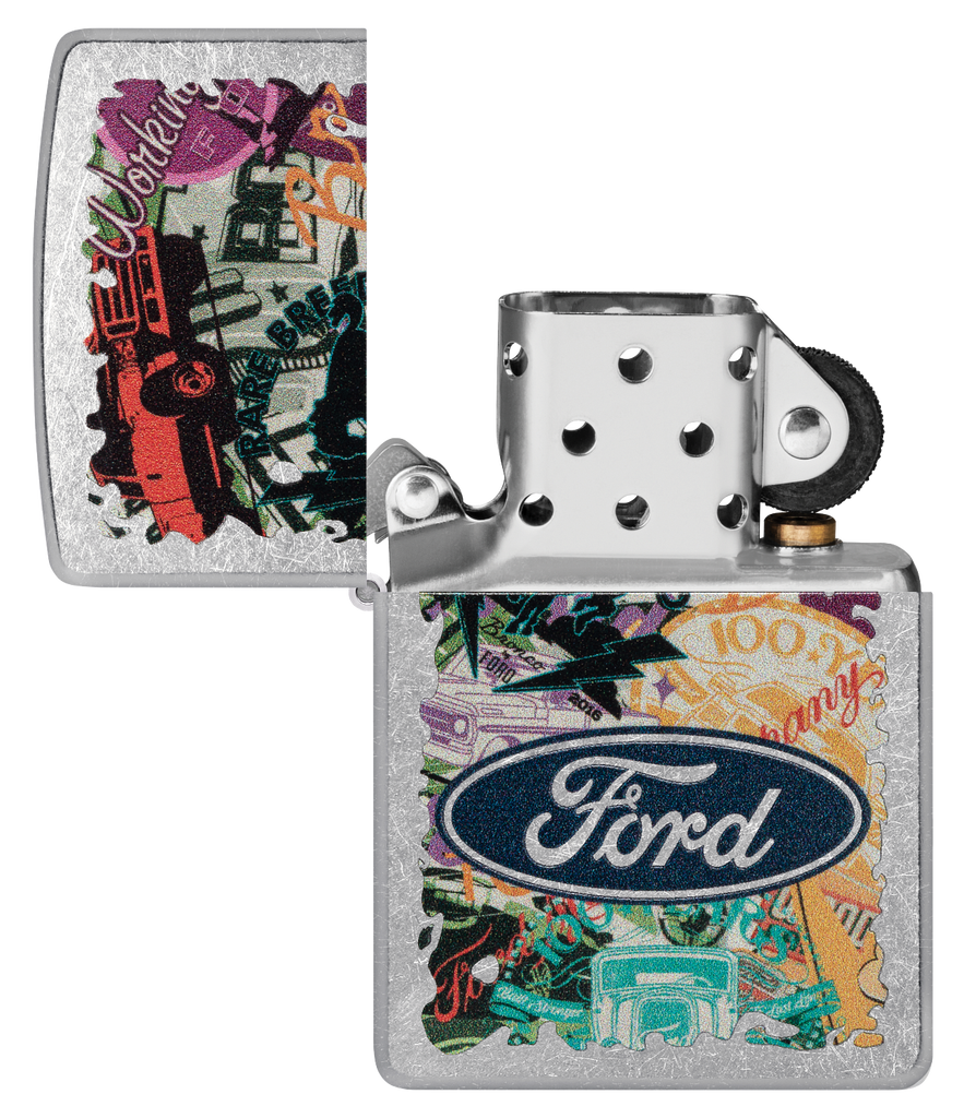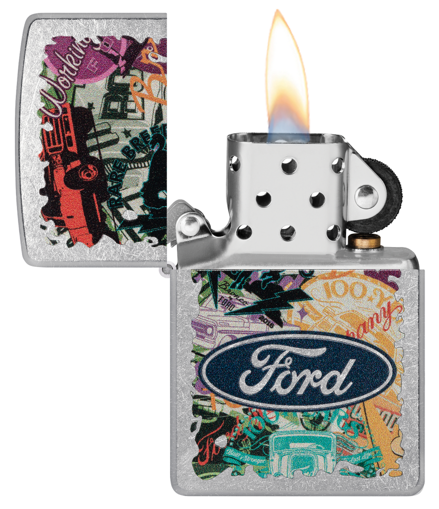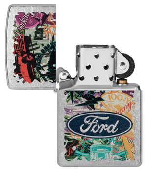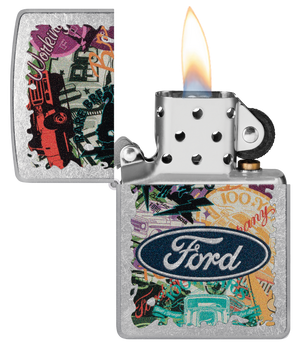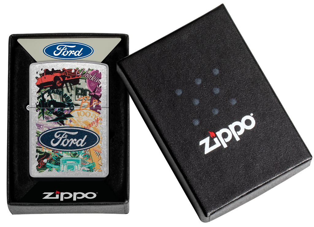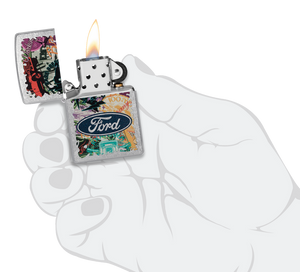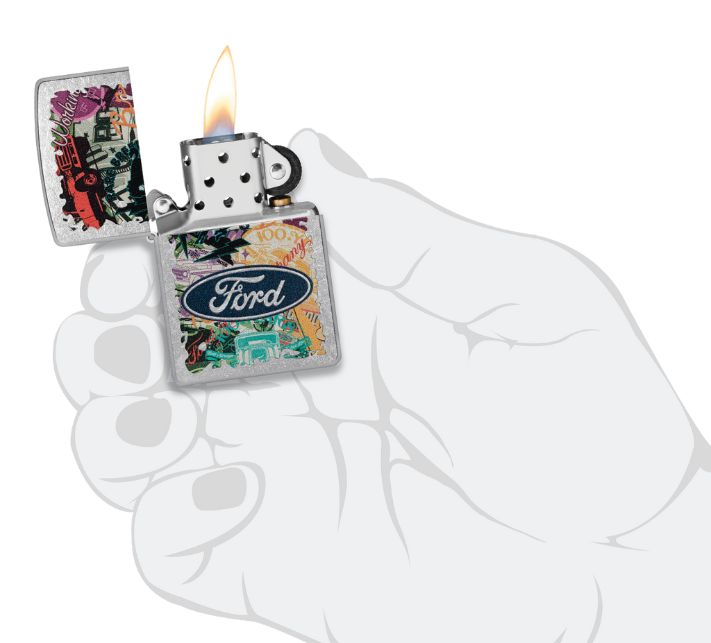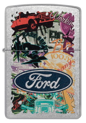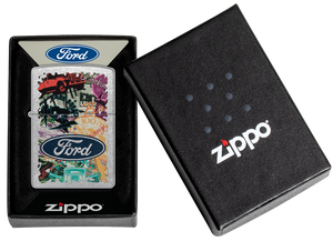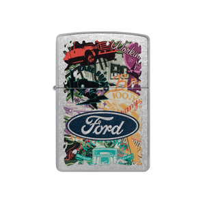Hit the road and take in the sights with this Street Chrome lighter. The Ford® logo stands proudoy over a bold collage of classic brand icons and milestones in an adventure-ready Color Image design. Comes packaged in a gift box. For optimal performance fill with Zippo lighter fuel.