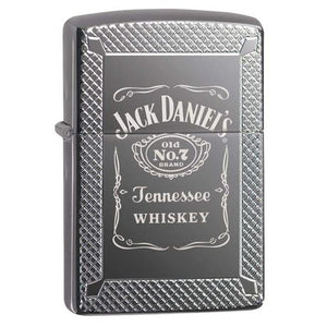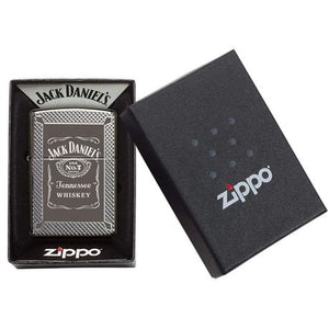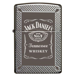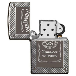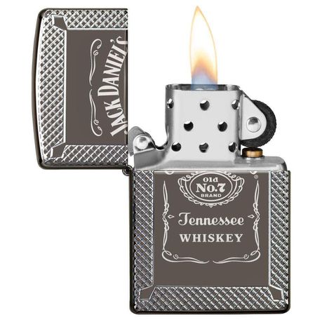 This High Polish Black Ice base model features a laser engraved classic Jack Daniel's Old No. 7 Tennessee Whiskey bottle label. A deep carved pattern frames the label giving the design elegance. Comes packaged in a gift box. For optimum performance, fill with Zippo lighter fuel.