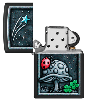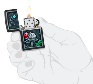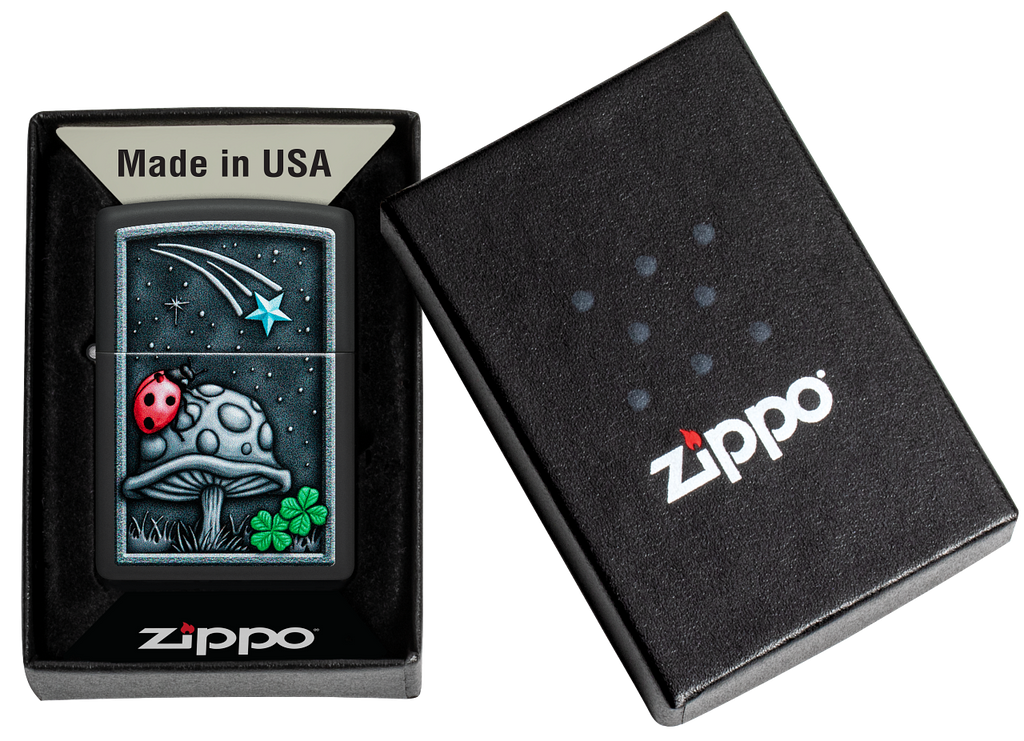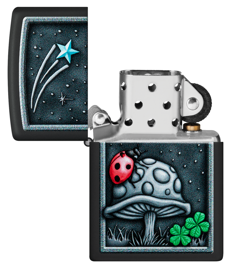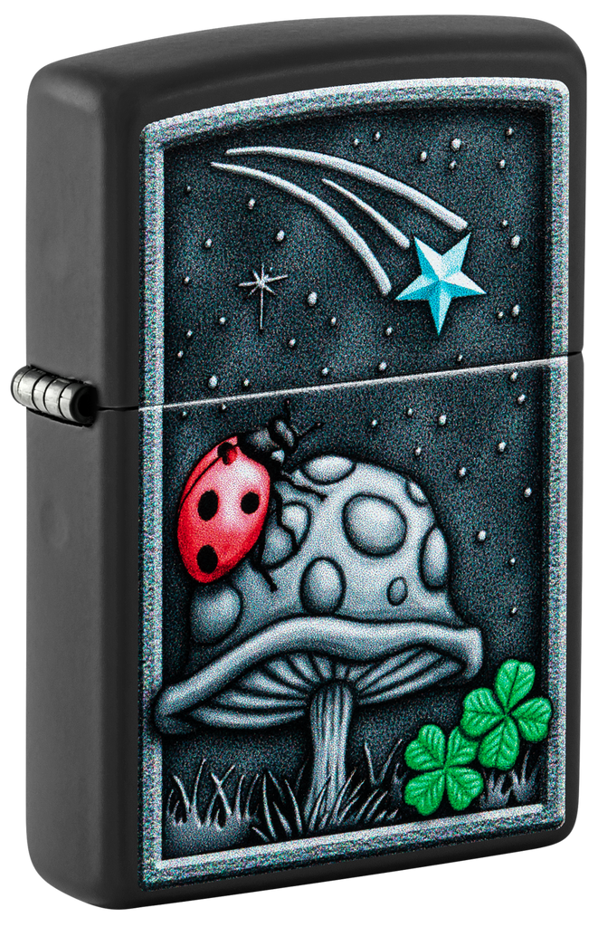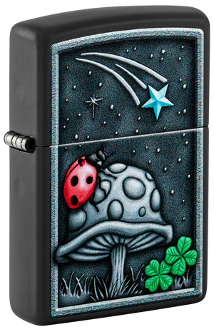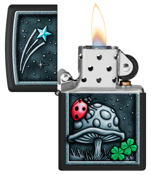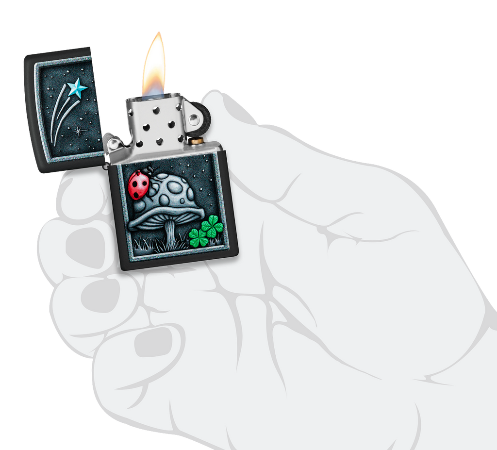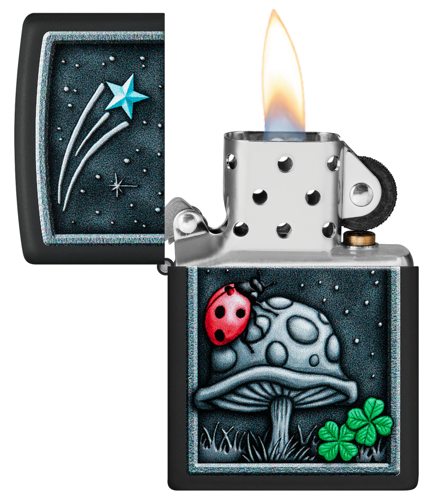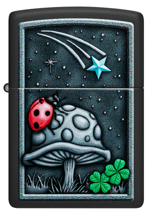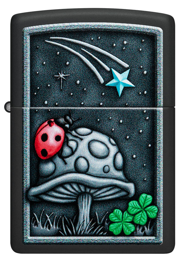 Even Lady Luck wishes on a star from time to time. This sleek Black Matte lighter features a lucky ladybug perched on a mushroom, accompanied by clovers and a shooting star in a wistful and whimsical Color Image design. Comes packaged in a gift box. For optimal performance, fill with Zippo lighter fuel.