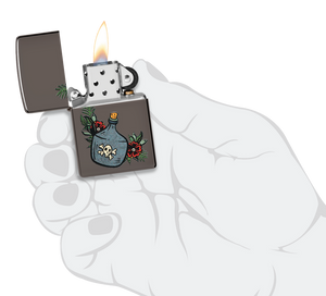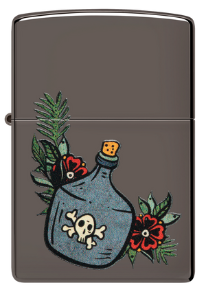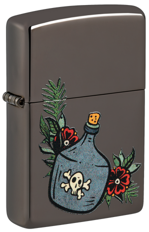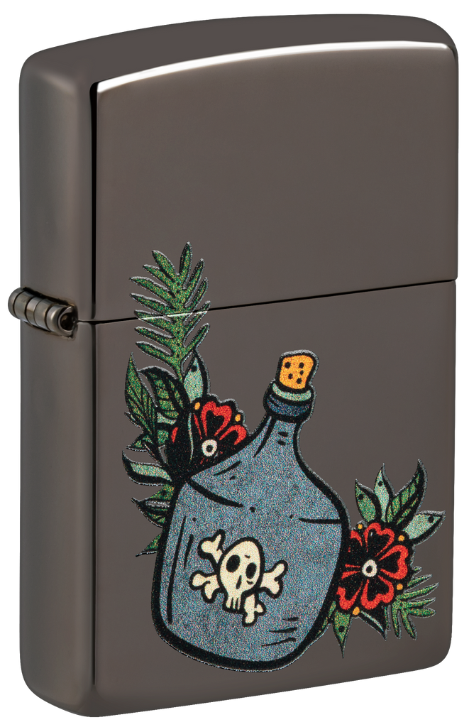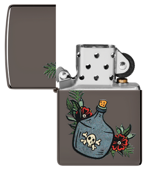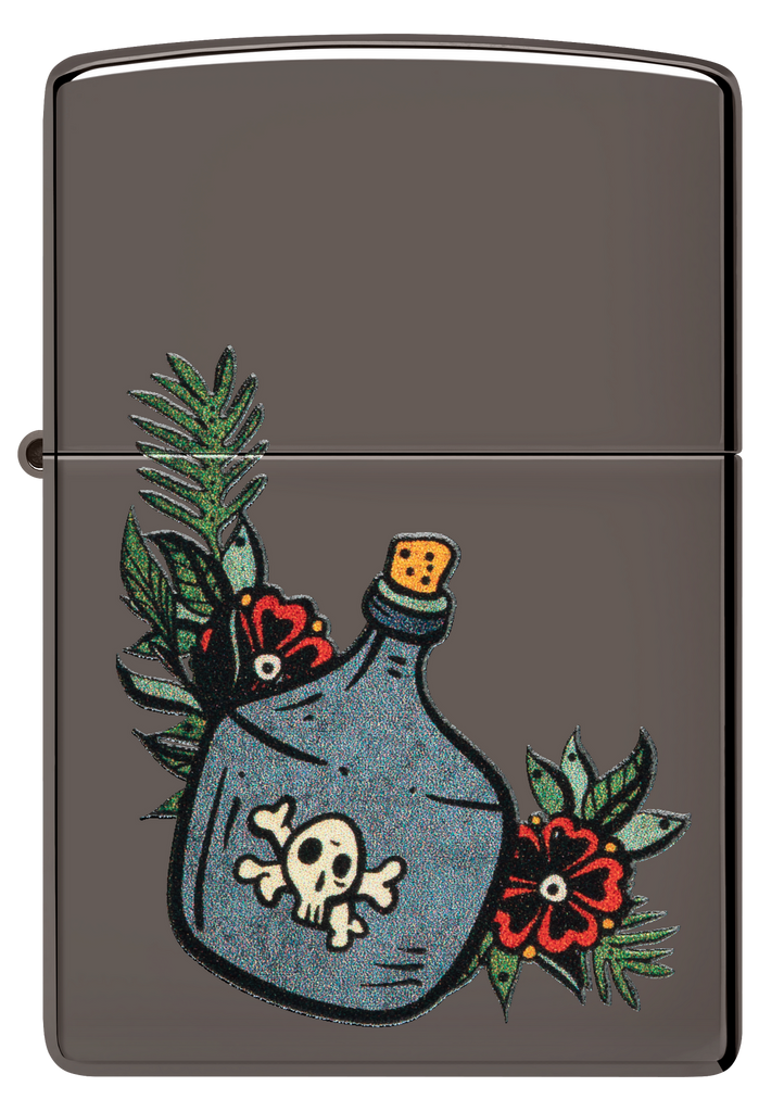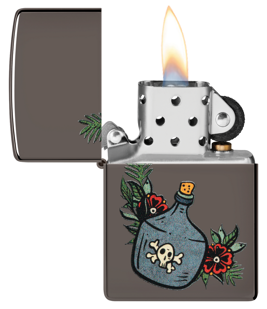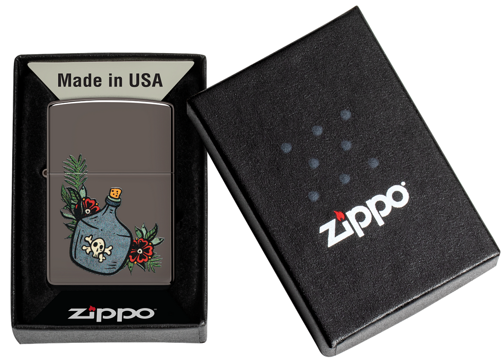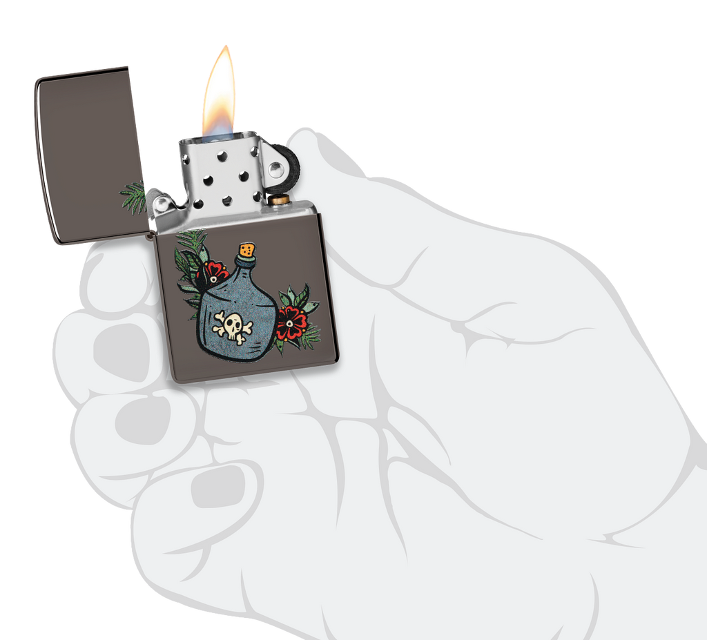 This classic Black Ice® lighter features a jug of the good stuff in a whimsical, tattoo-inspired Color Image design. Comes packaged in a gift box. For optimal performance fill with Zippo lighter fuel.