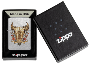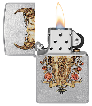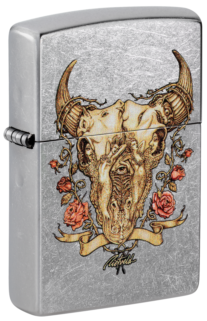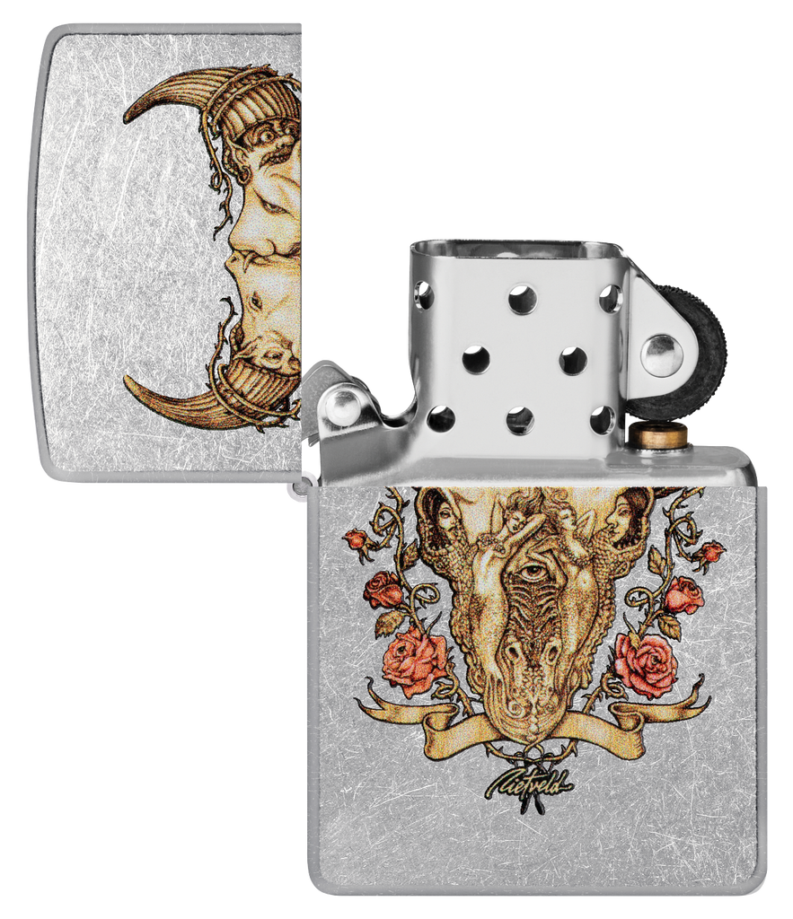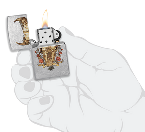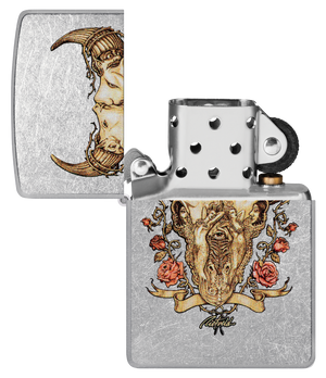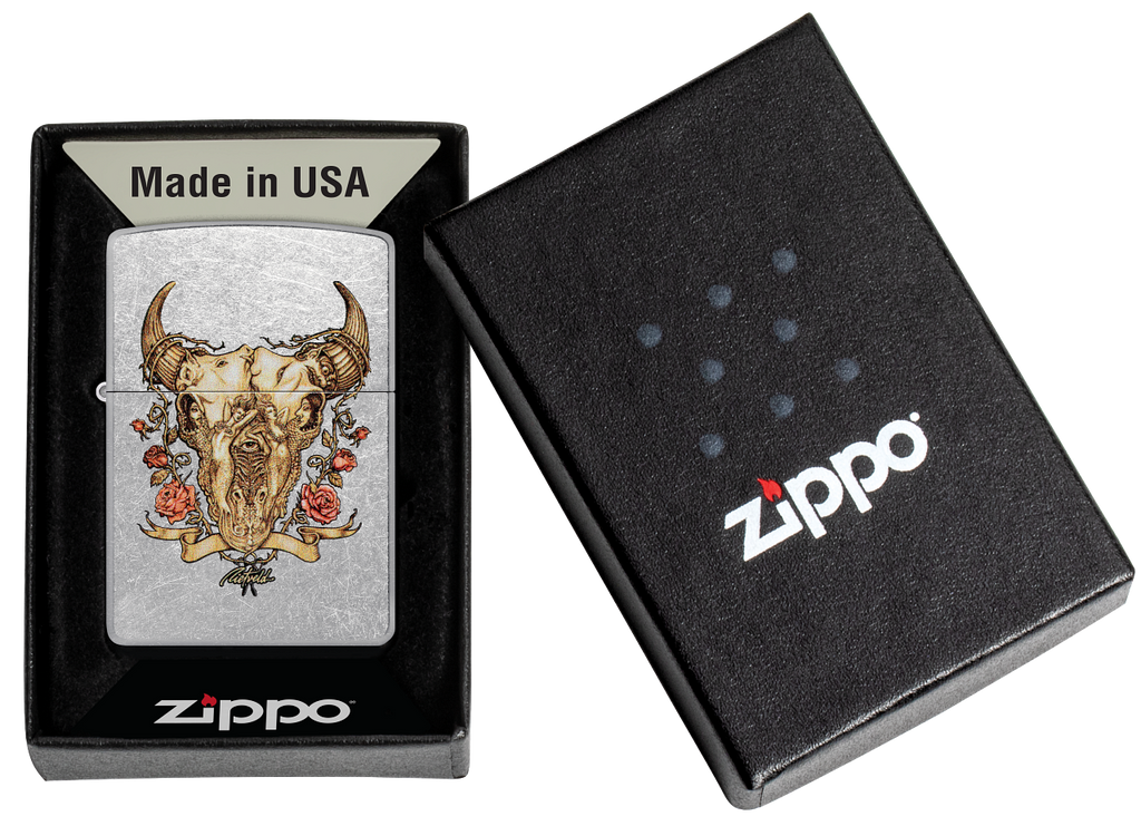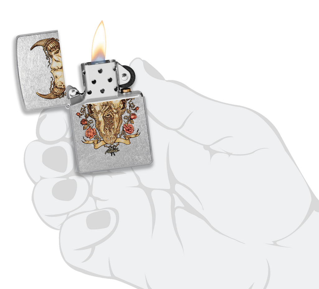The longer you look, the more you'll discover in this iconic Rick Rietveld creation. The intricate Color Image design stands in captivating contrast on the classic Street Chrome lighter beneath. Comes packaged in a gift box. For optimal performance, fill with Zippo lighter fuel.