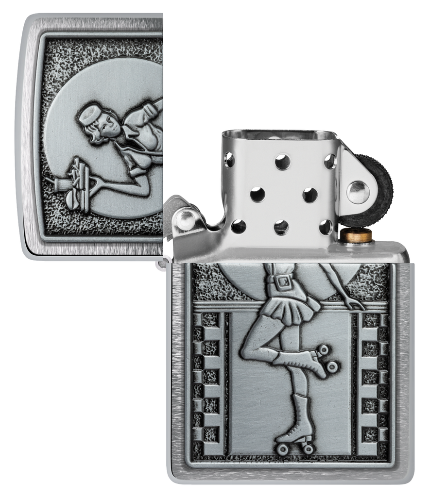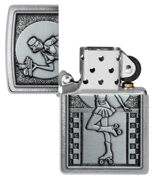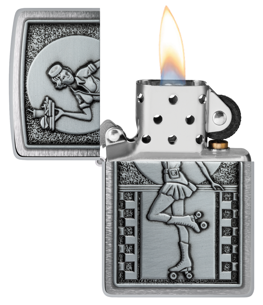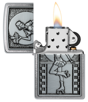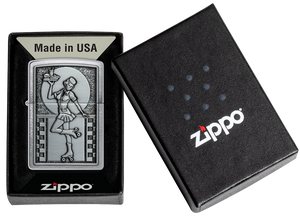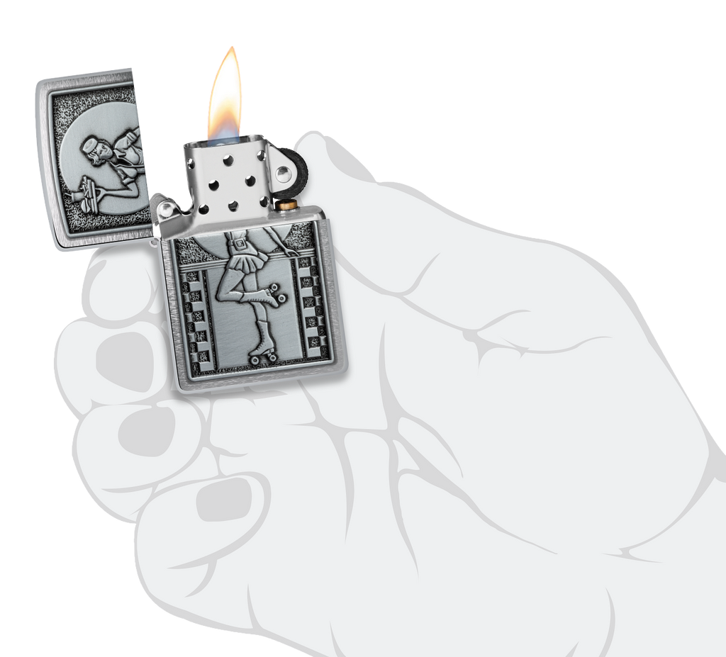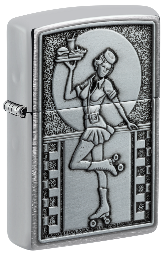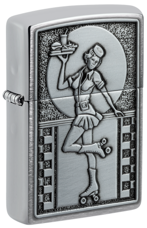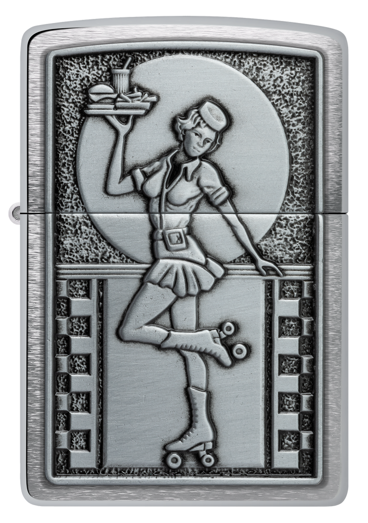 Order up! Revisit your favorite drive-in eatery with this classic Brushed Chrome lighter. The intricate metallic emblem features a skate-clad carhop serving up some French-fried goodness. Comes packaged in a gift box. For optimal performance, fill with Zippo lighter fuel.