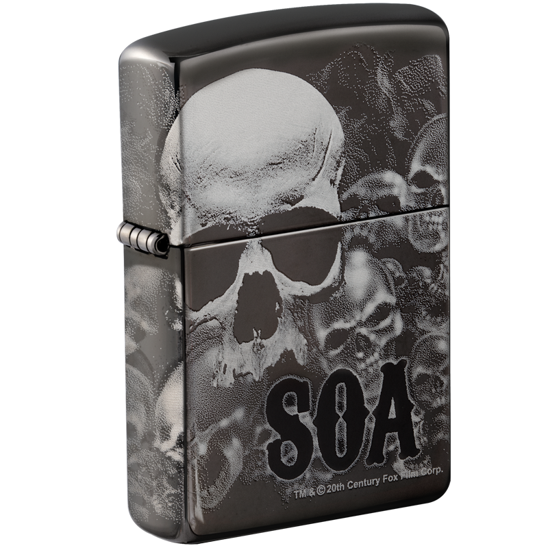 Display your passion and fandom for the Sons of Anarchy franchise with this new 360° design. Finished on a Black Ice lighter, the Sons of Anarchy Logo and skulls surround the entire lighter using photo imaging. Comes packaged in a gift box. For optimal performance, fill with Zippo lighter fuel.