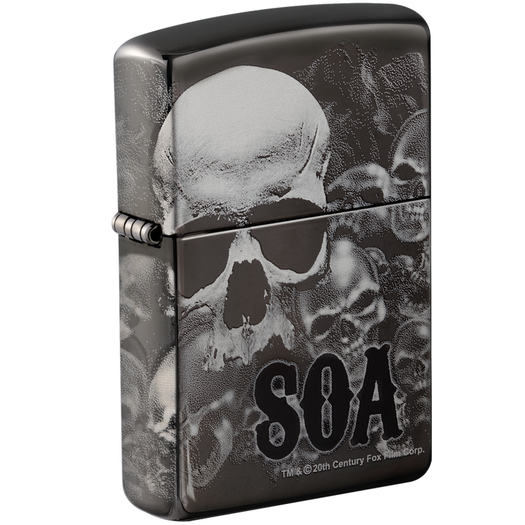 Display your passion and fandom for the Sons of Anarchy franchise with this new 360° design. Finished on a Black Ice lighter, the Sons of Anarchy Logo and skulls surround the entire lighter using photo imaging. Comes packaged in a gift box. For optimal performance, fill with Zippo lighter fuel.