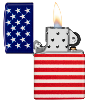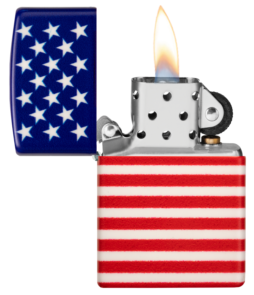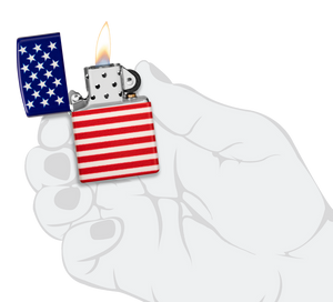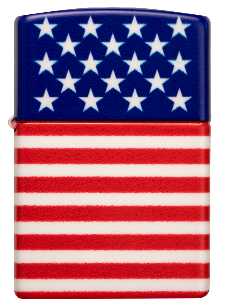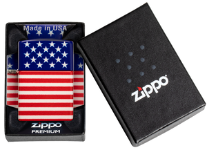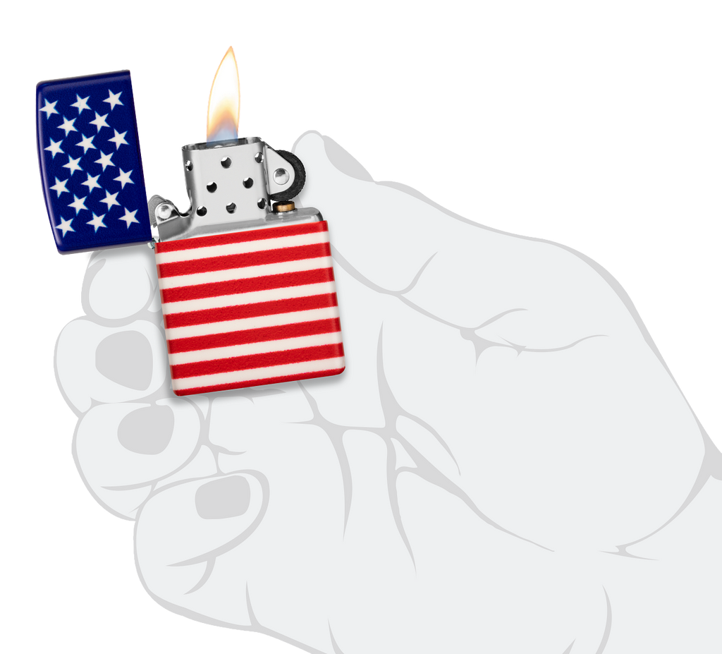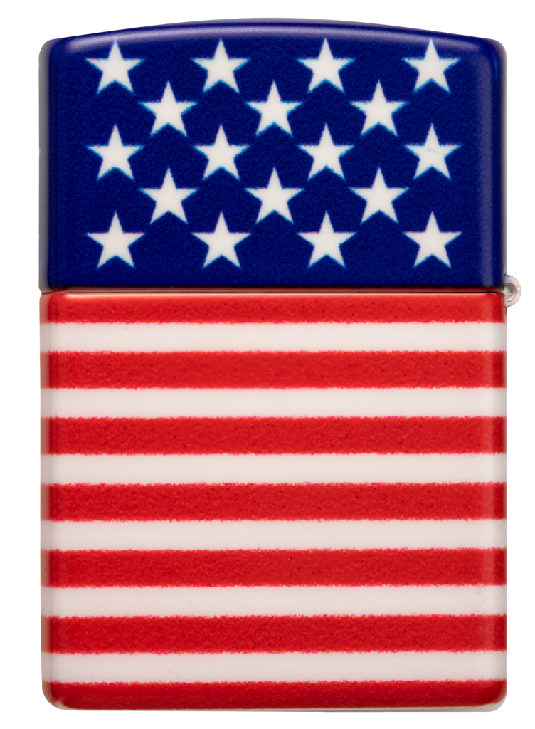 Show off your USA pride with this star-spangled 540 Color lighter. The bold stripes and shining bright stars of Old Glory seamlessly surround this patriotic piece. Comes packaged in a gift box. For optimal performance, fill with Zippo lighter fuel.