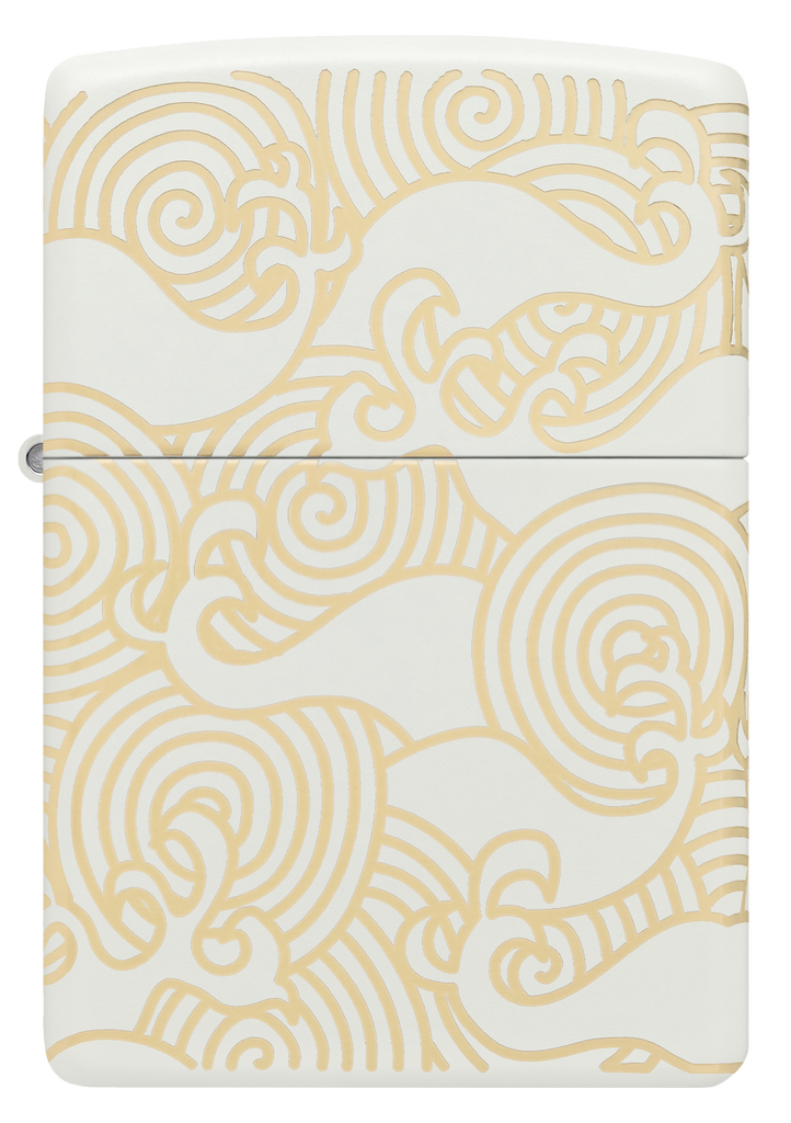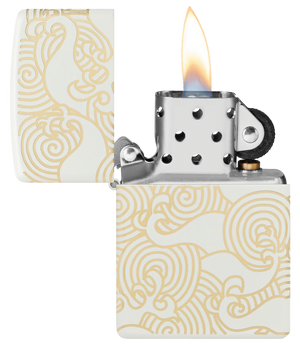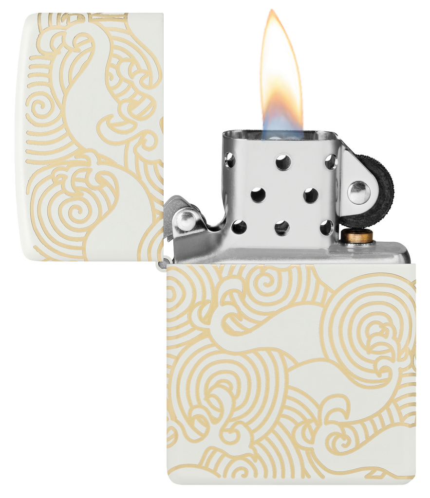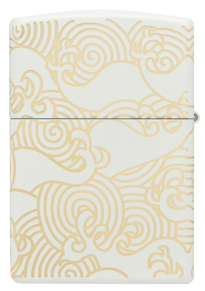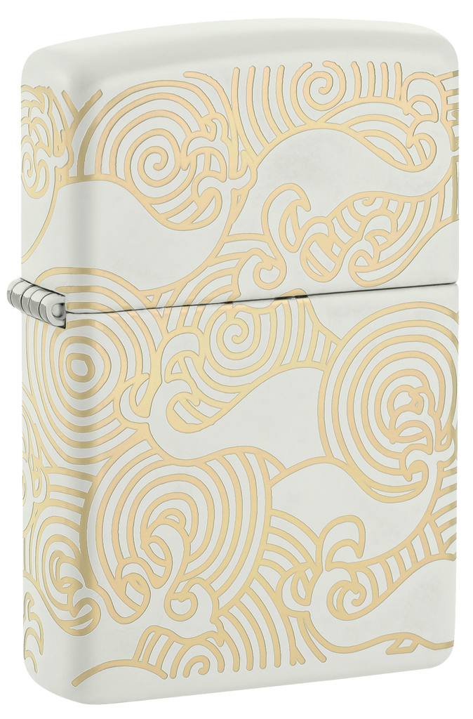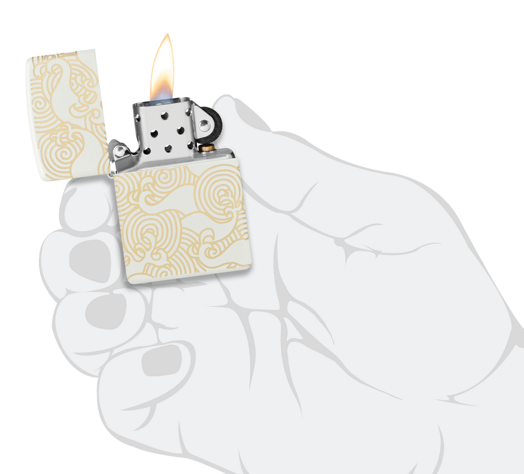 This serene White Matte model marks the debut of our crisp and precise Laser 360° engraving method on our signature matte base models – a treatment that was previously reserved for only the front surface. Revealed in luxurious brass tones, swirling waves tumble and churn around all sides of the piece in the delightfully seamless design. Comes packaged in a gift box. For optimal performance, fill with Zippo lighter fuel.