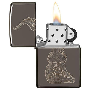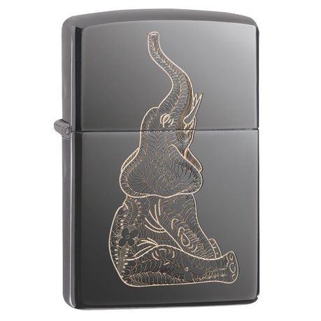 This lighter makes its debut as the first of its kind on zippo.com! Delicate swirls and floral designs are fused into this lighter to create an elephant design. This laser fancy fill design is finished on a Black Ice® lighter. Comes packaged in a gift box. For optimal performance, fill with Zippo lighter fluid.