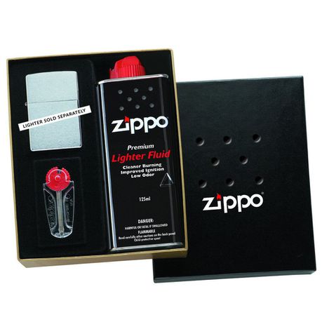 A Zippo lighter gift kit is the perfect way to give a Zippo windproof lighter. This gift kit includes a 6-flint dispenser and a 4 oz. can of Zippo lighter fluid. Add any classic Zippo lighter for a distinctive presentation. Comes packaged in a gift box.