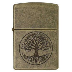 It's the Zippo tree of life. A growing tree decorates this Antique Brass lighter through the Lustre process, a small Zippo flame within its roots. Comes packaged in a gift box. For optimal performance, use with Zippo premium lighter fuel.